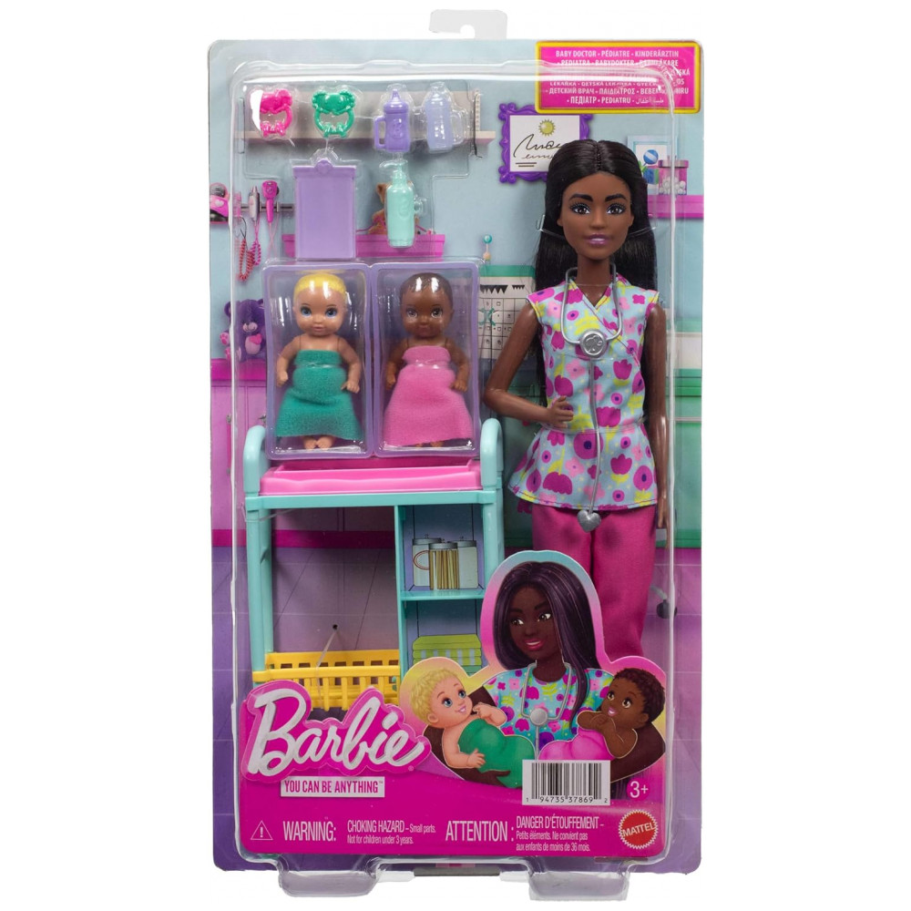 O playset Barbie Careers Baby Doctor permite encenar histórias de cuidado com bebês, com uma boneca Barbie morena médica e dois bebês pacientes. O conjunto inclui uma mesa de exame com espaço para acomodar os dois bebês deitados, com mantas para cobri-los e área de armazenamento para os acessórios. A Barbie usa scrubs rosa com tamancos brancos, caracterizando a profissão na área da saúde.