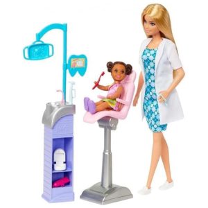 Este playset vem com 2 bonecas, uma estação odontológica, cadeira de paciente e acessórios menores, como utensílios dentais, escova e pasta de dente.