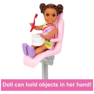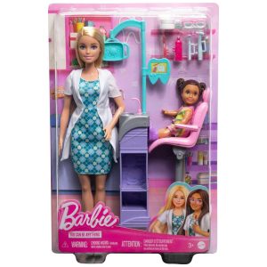 Vestida com seu jaleco branco, a boneca Barbie Dentista está pronta para cuidar de seu adorável paciente bebê.