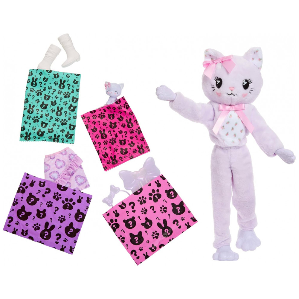 A Barbie Cutie Reveal Cuddly Series estilo Kitten traz uma personagem Barbie dentro de um macacão de pelúcia de gatinho roxo pastel, com experiência de unboxing focada em texturas macias, transformação e mini pet. O traje tem laços decorativos e aparência de bichinho de pelúcia, pensado para crianças que gostam de animais fofos e fantasia.