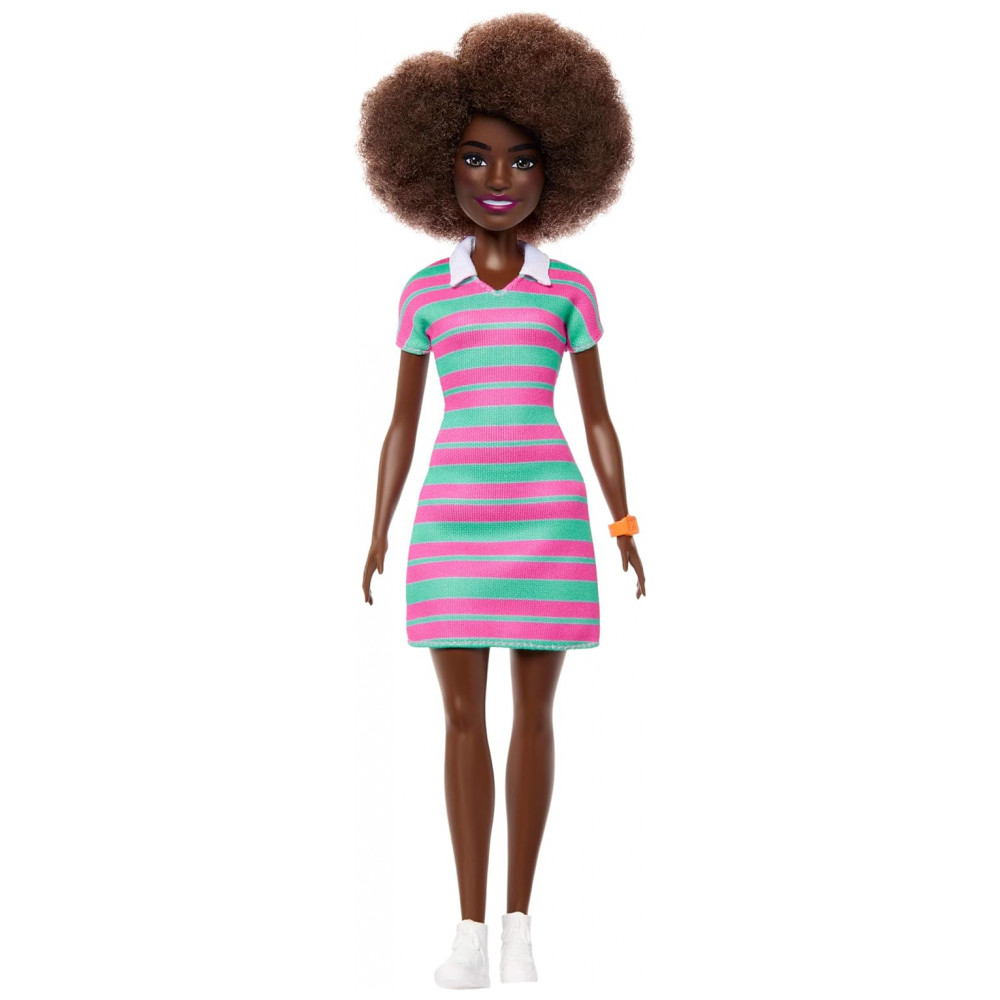 A Barbie Fashionistas #247 apresenta corpo petite e cabelo preto cacheado, com visual casual e colorido para o dia a dia. Ela veste um vestido com gola, em estilo camisaria, com listras alternadas em rosa chiclete e verde menta. Os acessórios incluem relógio laranja no pulso e tênis brancos, completando um look confortável para passeios e momentos com amigos. Indicada para crianças a partir de 3 anos, a boneca não fica em pé sozinha.