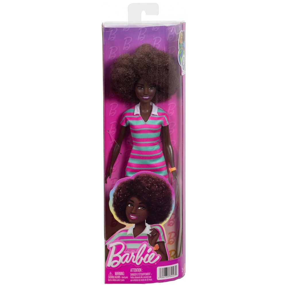 Barbie Fashionistas 247 – Boneca com Cabelos Cacheados Pretos Vestido Listrado Rosa e Verde Relógio Laranja e Tênis Branco