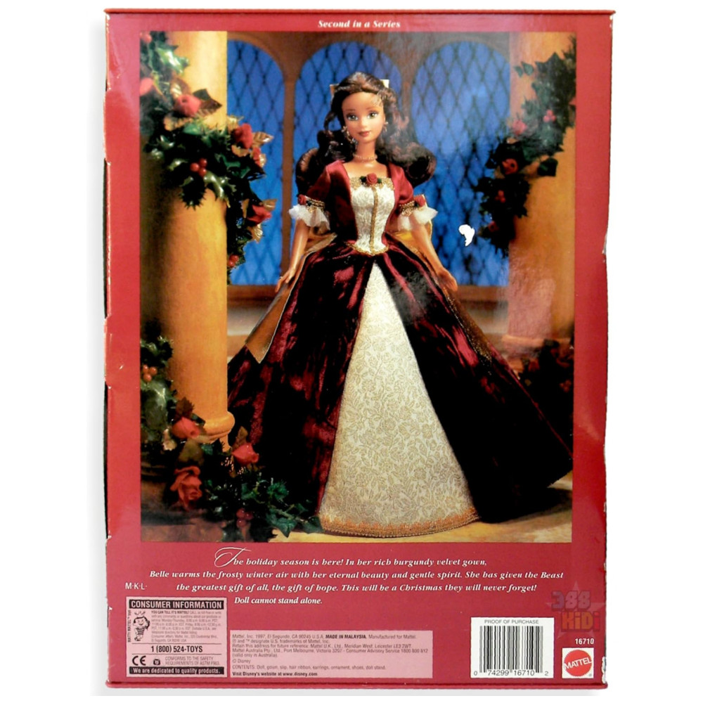 A boneca Holiday Princess Belle Special Edition, produzida pela Mattel, representa a personagem Belle em uma versão temática de fim de ano, voltada principalmente para colecionadores e fãs de princesas. O modelo apresenta a personagem em escala padrão de aproximadamente 30 cm de altura, com corpo fashion articulado em pontos básicos, adequado para poses estáticas em suporte de exposição.