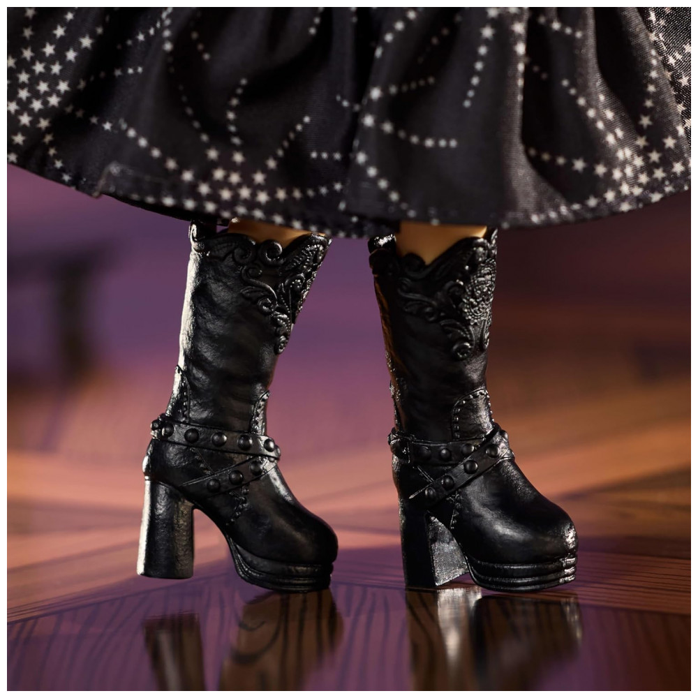 A boneca veste vestido preto de inspiração boho chic baseado em look de passarela da coleção Primavera 2007 da grife Anna Sui, combinado com botas de cano médio em tom escuro. A caracterização inclui lábios vermelhos e delineado preto marcado, elementos associados à maquiagem característica da estilista.