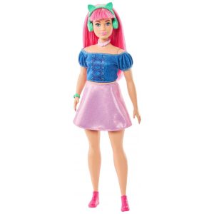 Visual da boneca: Corpo curvy, cabelo rosa, olhos azuis, saia rosa brilhante, blusa azul, botas rosas