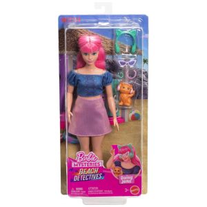 A Barbie Mysteries: Beach Detectives Daisy representa a personagem Daisy da série animada, com visual curvy, cabelo rosa e roupa idêntica à que aparece na animação ambientada em Malibu. O foco do conjunto é incentivar narrativas de mistério na praia, combinando moda casual com acessórios temáticos e um pet gatinho com fones.