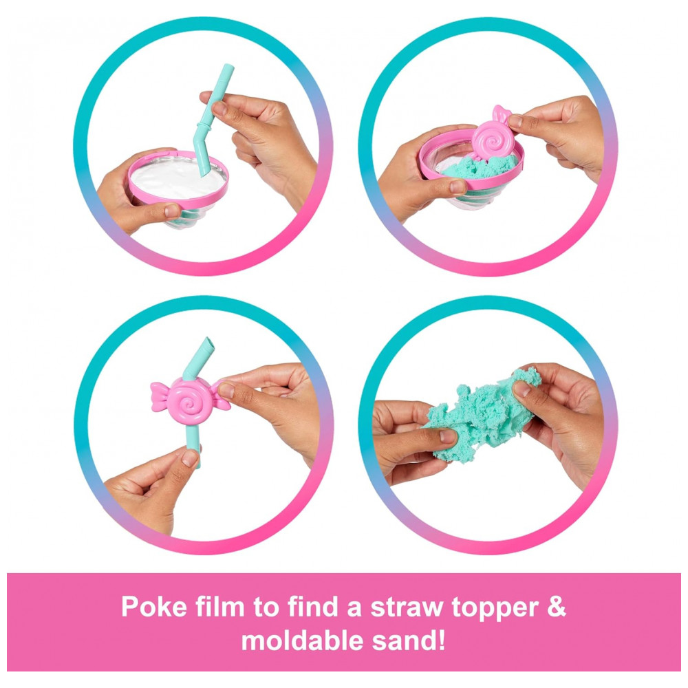 Conteúdo da embalagem: 1 copo temático com tampa e canudo, 1 boneca Sweet Swirl, 2 cubos de gelo com acessórios, 1 saia, 1 pet cachorrinho “squishy”, 1 caminha de pet, areia moldável