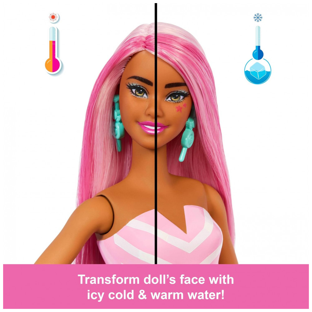 A boneca conta ainda com efeito de mudança de cor no rosto: com água bem fria, detalhes aparecem ou se transformam, retornando ao original com água morna, permitindo repetir o efeito. O conjunto é indicado para crianças a partir de 3 anos e integra a linha Pop Reveal Treat Series, que inclui ainda variações Donut Dreams e Cool Cupcake.