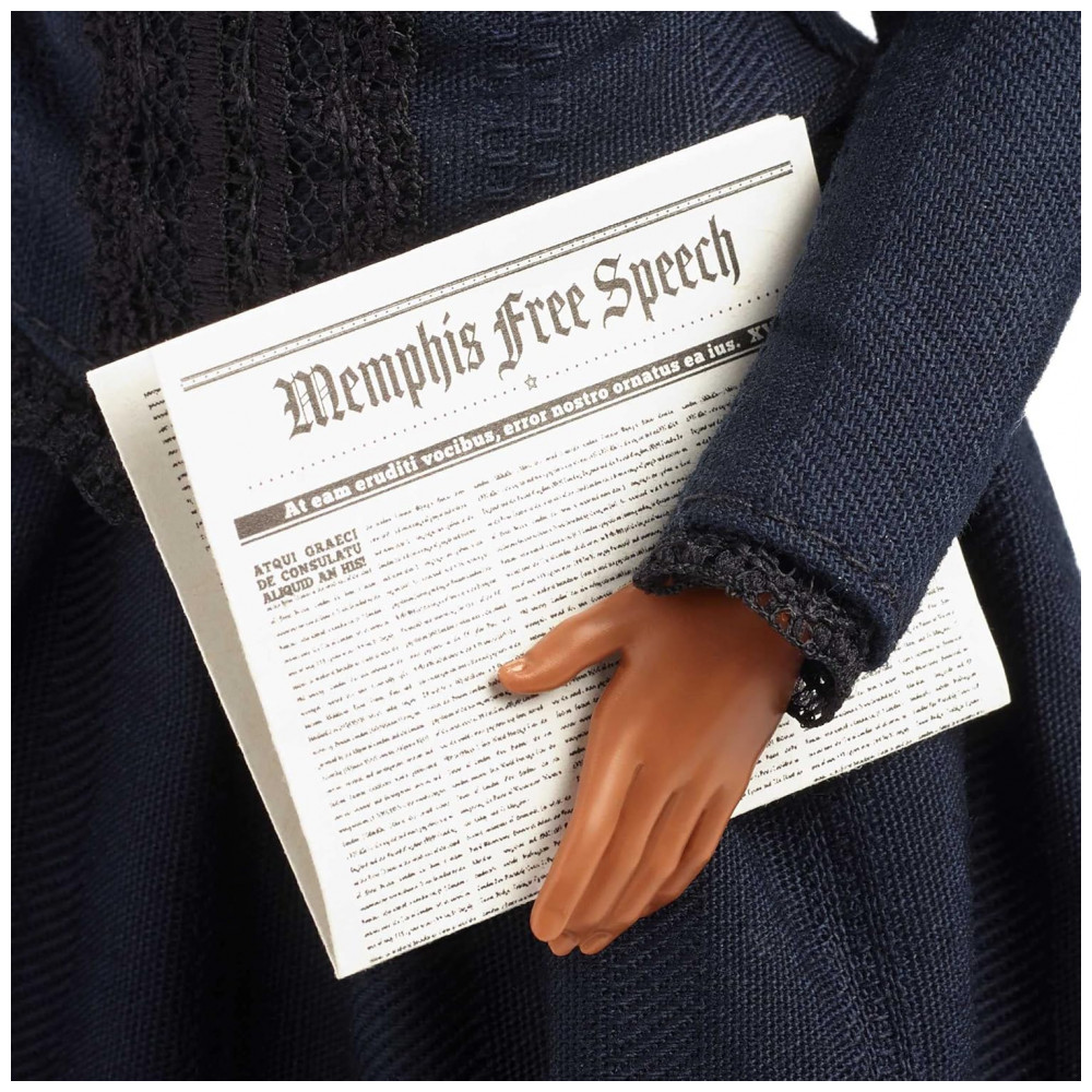 A boneca é esculpida à semelhança de Ida B. Wells, com penteado preso característico e expressão facial séria, adequada à figura histórica representada. O corpo articulado permite ajustes de braços, cabeça e pernas para diferentes poses em prateleiras, vitrines e cenários educativos. Acompanha acessório de jornal “Memphis Free Speech”, referência ao periódico que ela coeditou ao denunciar injustiças contra a população negra.