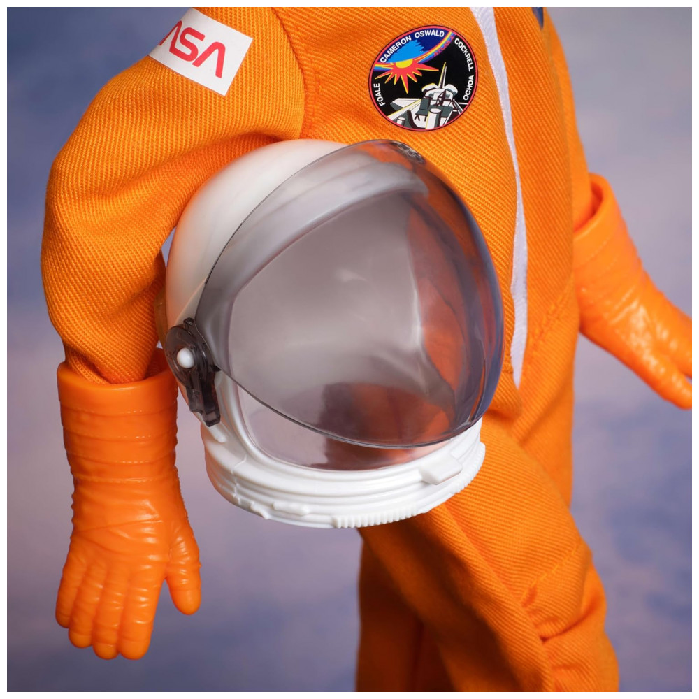 A boneca usa macacão laranja de voo espacial com modelagem utilitária e diversos patchs impressos que remetem a emblemas de missões e insígnias da NASA. O conjunto inclui botas, luvas removíveis e capacete rígido branco com viseira transparente, completando o visual de preparação para lançamento. O cabelo é mantido preso e bem rente à cabeça, com bastante gel para caber sob o capacete, podendo ser lavado pelo colecionador para deixar a textura mais solta conforme algumas avaliações de usuários.
