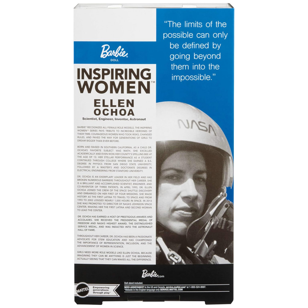 A Barbie Signature Inspiring Women Ellen Ochoa homenageia a primeira mulher hispânica a ir ao espaço, trazendo a personagem em um traje laranja de astronauta inspirado nas missões de ônibus espacial. A proposta da linha é destacar mulheres reais que romperam barreiras em suas áreas, funcionando tanto como item de coleção quanto como recurso educativo em STEM.