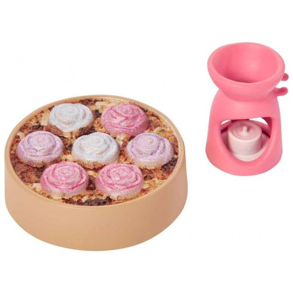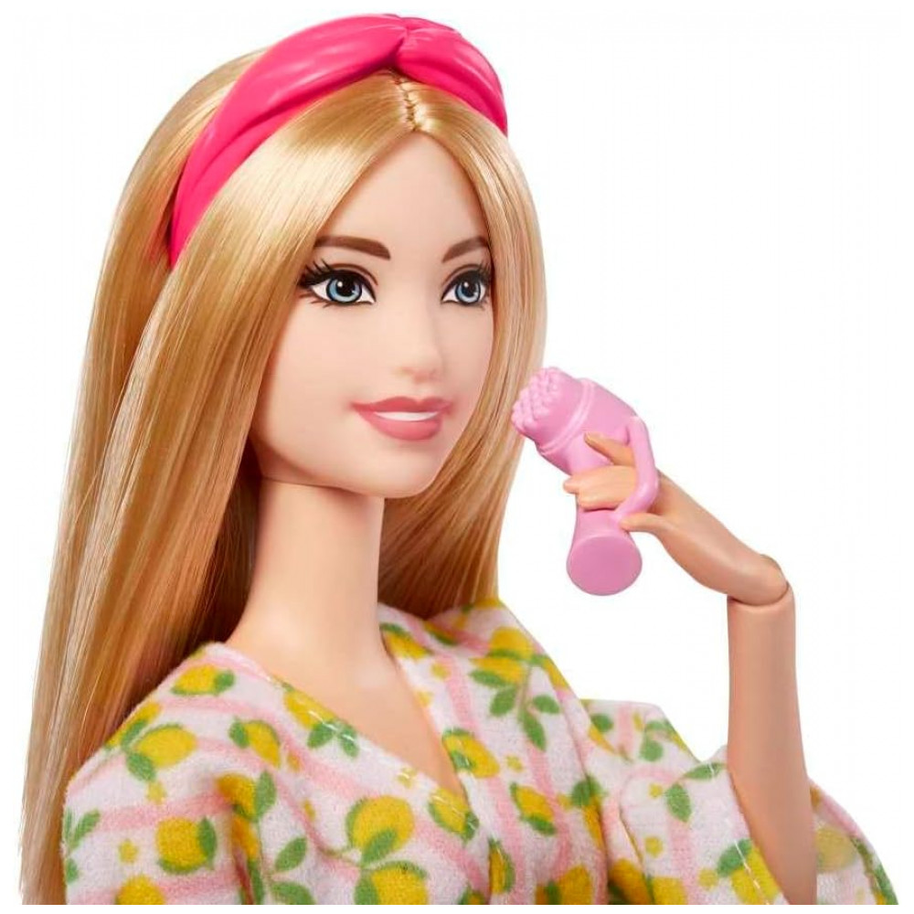A boneca vem vestida com roupão confortável com estampa de limões, acompanhado de tiara de tecido para segurar o cabelo e chinelos, caracterizando um visual de spa em casa adequado a histórias de banho e relaxamento. O filhote de cachorro incluso possui uma pequena máscara de olhos rosa, reforçando o tema de autocuidado compartilhado entre personagem e pet. Entre os acessórios temáticos estão máscara para os olhos, patinho de borracha, frascos de sabonete e itens de banho, que contribuem para o desenvolvimento de narrativas de bem-estar e cuidado com o corpo.