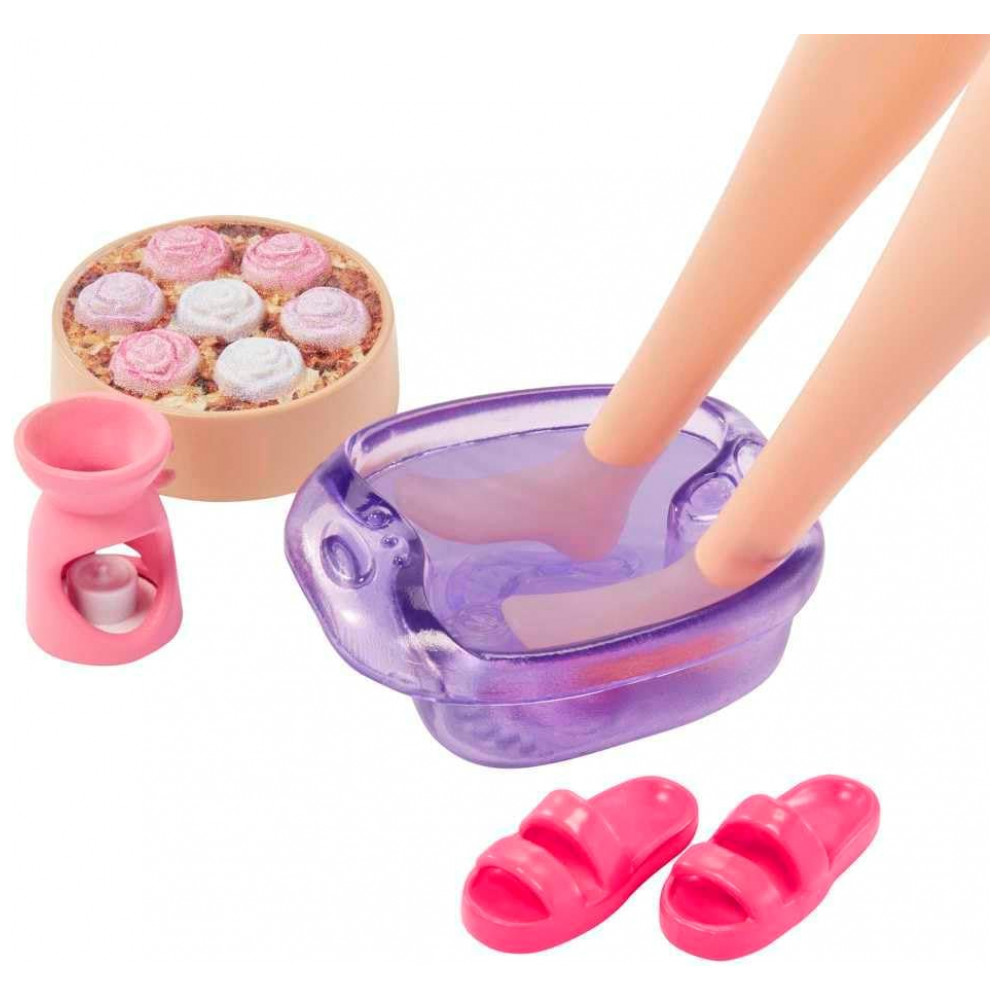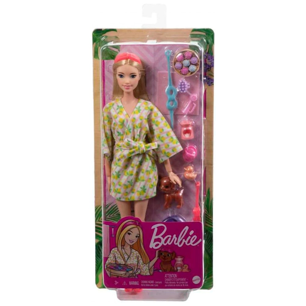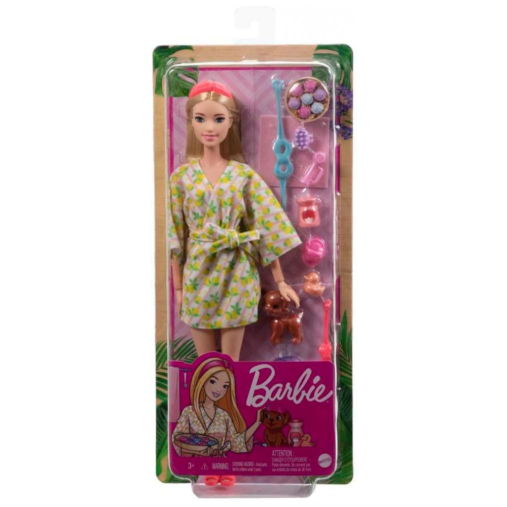 Esta boneca Barbie Dia de Spa da linha Self-Care foi desenvolvida para representar uma rotina de autocuidado em ambiente doméstico, com foco em banho, relaxamento e brincadeiras temáticas com acessórios de spa. O conjunto inclui boneca loira articulada, filhote de cachorro em miniatura e peças que simulam produtos de banho, permitindo encenar diferentes situações de cuidado pessoal e momentos de descanso.