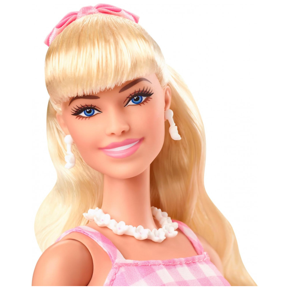 O traje inclui vestido em padrão gingham rosa e branco, com saia de comprimento midi e pregas que dão volume controlado, adequado para posicionar a boneca em bases e cenários. Os acessórios de moda abrangem colar em corrente de margaridas, brinco tipo pingo com flores, pulseira rosa e sapatos de salto em tom rosa com detalhe de coração, compondo um conjunto coerente com o visual visto no filme. O cabelo loiro longo é penteado em meio rabo preso com fita rosa, deixando à mostra os brincos e enquadrando o rosto de forma semelhante à aparência da personagem em cena.