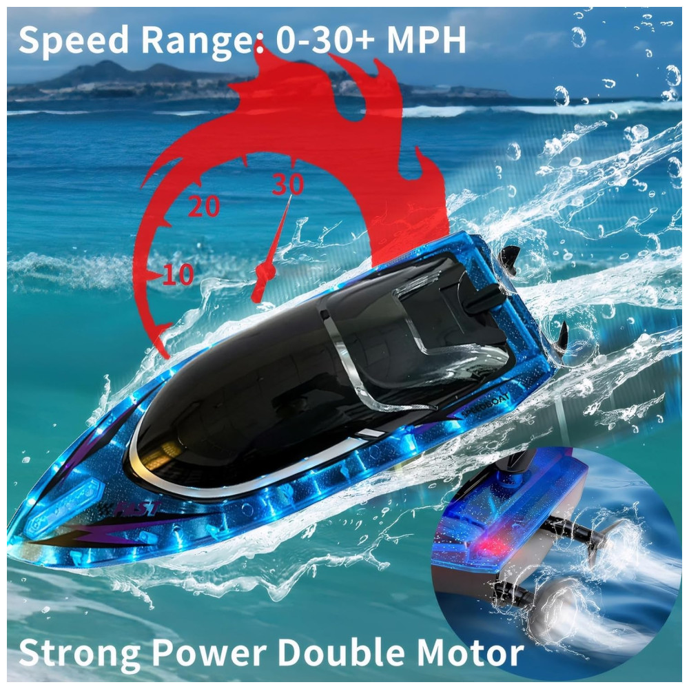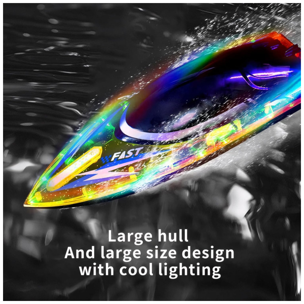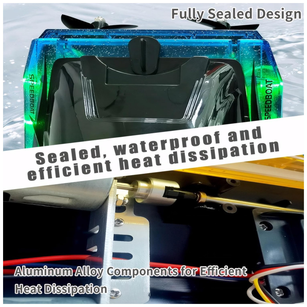 Este barco de controle remoto apresenta o design mais moderno de 2024, com uma aparência otimizada e uma estrutura interna que reduz significativamente o arrasto do casco. Equipado com dois motores de alta potência, ele pode atingir velocidades de até 56 KM/H e possui um alcance de controle remoto de aproximadamente 151,98 metros, proporcionando corridas aquáticas emocionantes.