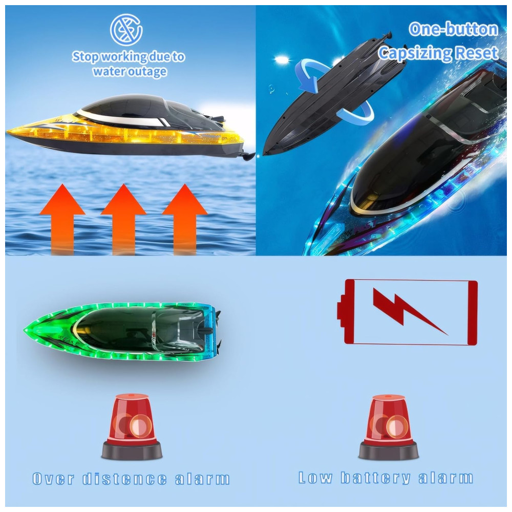 Funções Práticas: Inclui lembretes de bateria fraca e de sobredistância, função de redefinição de capotamento e sensor que desativa o barco fora da água.