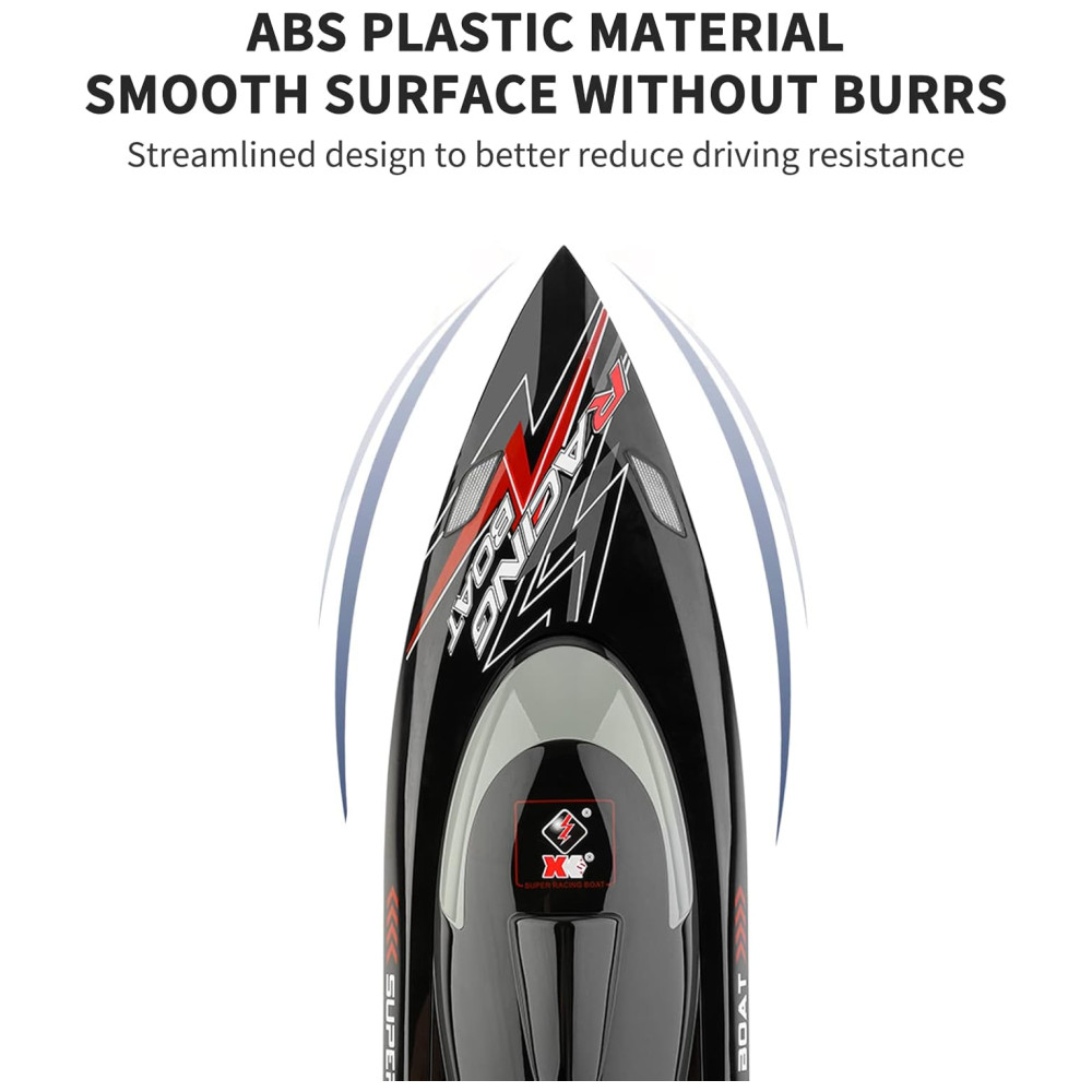 O controle remoto opera na frequência de 2,4 GHz, assegurando uma conexão sem interferências e um sinal estável. O casco é fabricado em plástico ABS ecologicamente correto, tornando-o forte e durável, com um design simplificado que reduz a resistência da água.