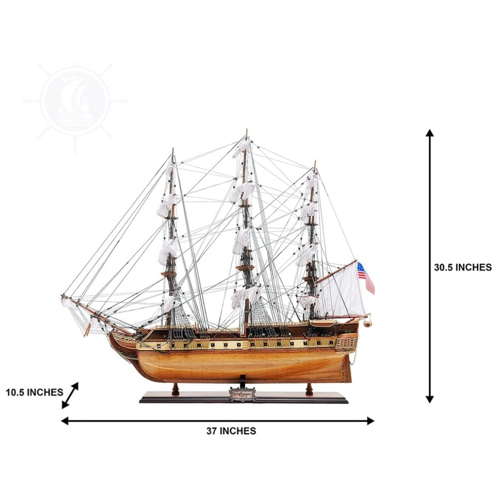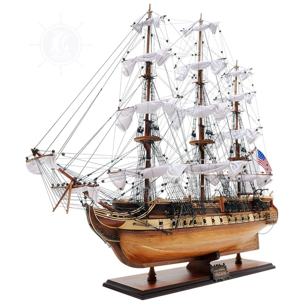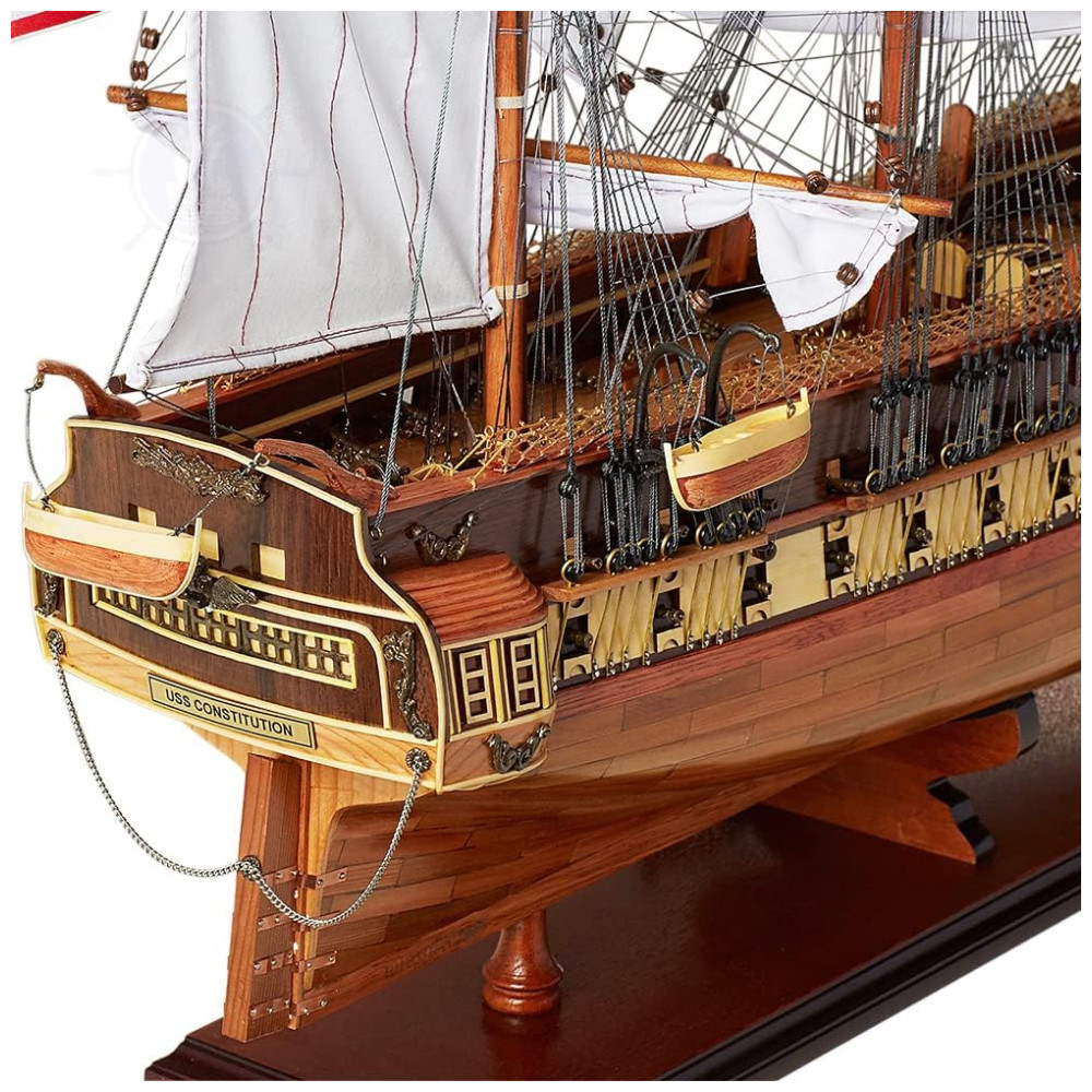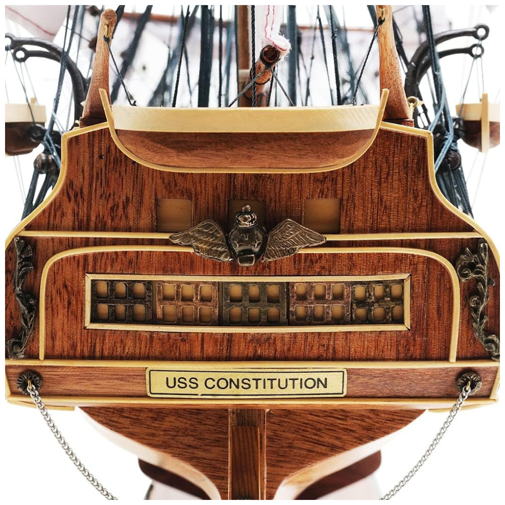 Os destaques incluem âncoras e canhões de metal, um ninho de corvo autêntico, cordame intrincado, velas enroladas, casco e convés embutidos, popa ornamentada, entre outros detalhes finamente elaborados. Livre de peças plásticas, este modelo repousa sobre uma base sólida de madeira com uma placa de metal, medindo 96,52 cm x 33,02 cm x 81,28 cm, capturando a magnitude do USS Constitution histórico.