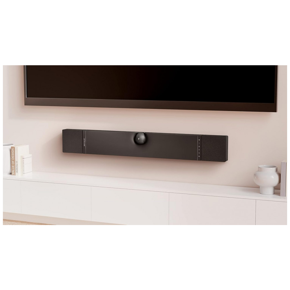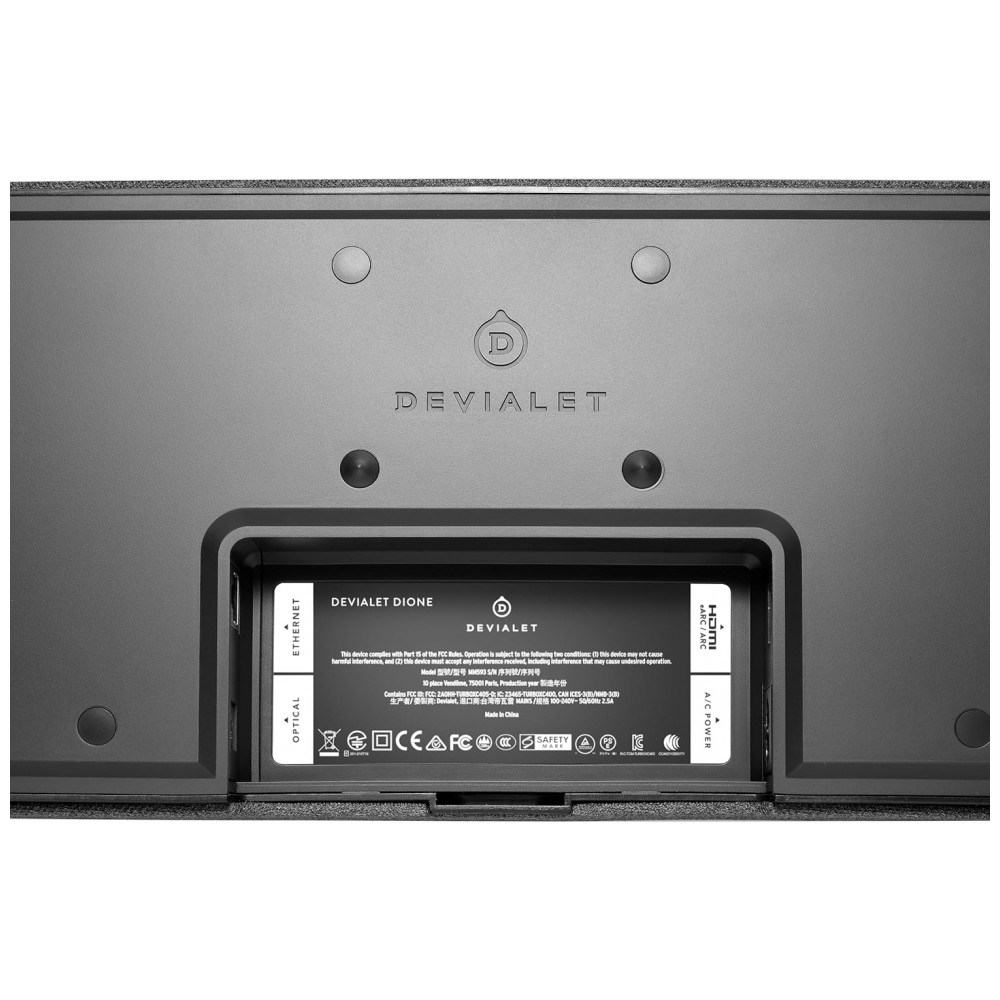 Conteúdo da embalagem: Barra de som Devialet Dione, cabo HDMI de alta velocidade, cabo óptico TOSLINK, cabo de alimentação, documentação, guia de montagem em parede e acessórios de fixação