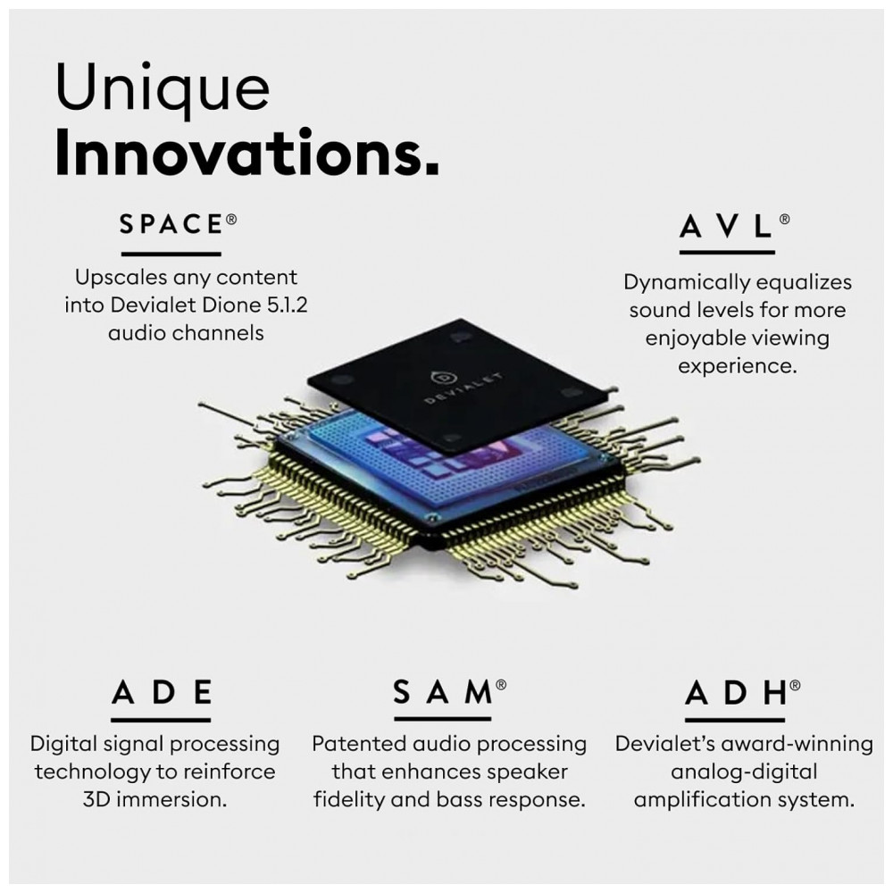 A barra de som Devialet Dione é um sistema de áudio tudo‑em‑um com configuração 5.1.2 canais, projetado para substituir conjuntos tradicionais de receiver, caixas frontais, surround e subwoofer em instalações de home theater de alto padrão. Com 17 alto-falantes de neodímio dedicados e potência total de 950W RMS, o equipamento entrega até 101 dB de pressão sonora, cobrindo uma faixa de resposta de 24 Hz a 21 kHz para reproduzir graves profundos, médios articulados e agudos detalhados.