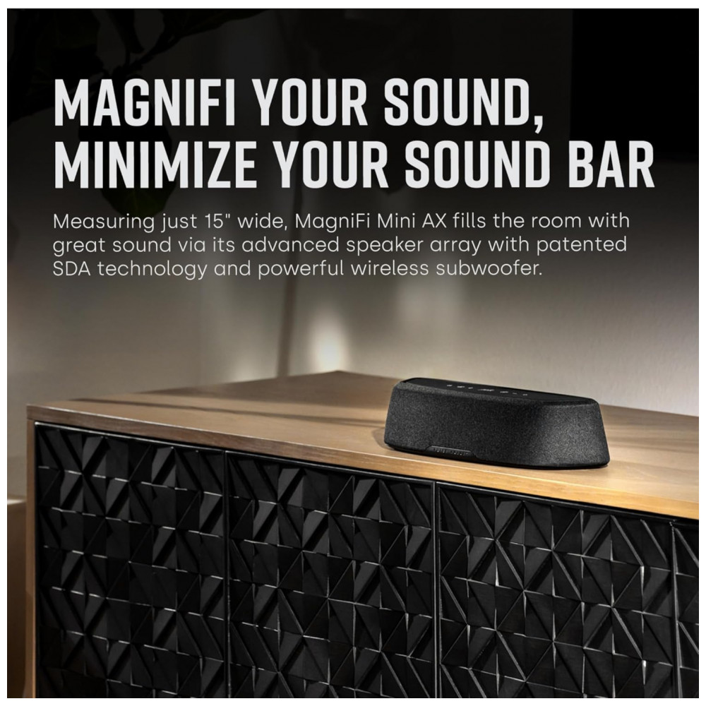 A barra de som Polk Audio MagniFi Mini AX é um sistema 5.1 compacto com subwoofer sem fio desenvolvido para melhorar o som de TVs em salas de estar e ambientes de entretenimento doméstico. O conjunto utiliza uma barra de formato reduzido com matriz de cinco drivers e um subwoofer dedicado, proporcionando palco sonoro amplo, efeitos surround virtuais e graves reforçados em um conjunto de dimensões reduzidas em relação às barras tradicionais.