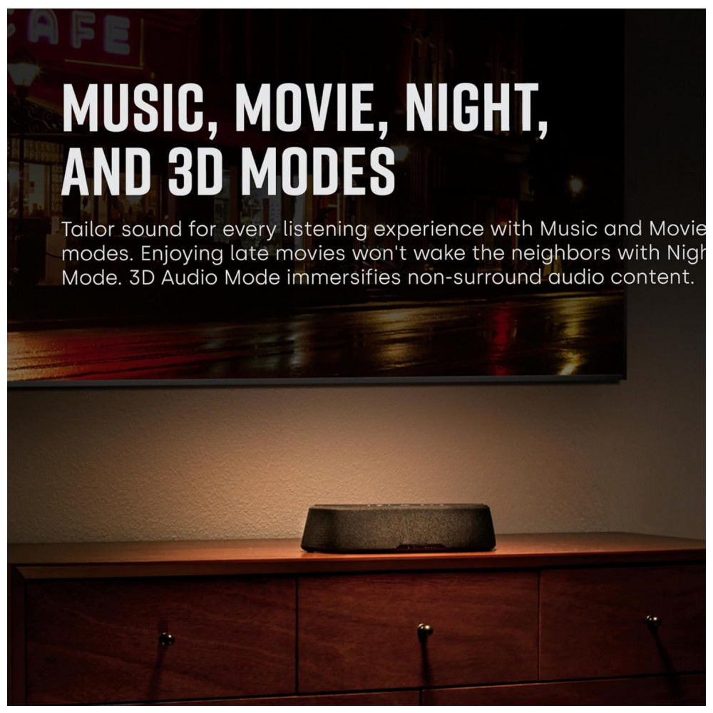 Modos de som: Perfis dedicados para TV, filmes, música e modo noite com ajuste de graves e diálogo