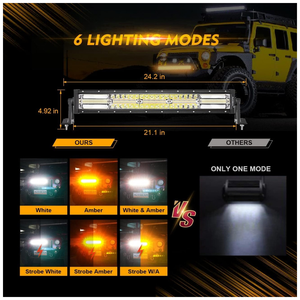 ATUALIZAR 6 MODOS DE ILUMINAÇÃO A barra de luz de 55 centimetros do feixe auxiliar com kit de chicote de fiação personalizado é muito adequada para luzes off road, luzes de advertência, faróis de neblina, luzes de direção ou luzes de trabalho. Você pode alternar entre 6 modos de direção através do nosso controle remoto luz de direção branca, luz de neblina âmbar, luz combinada branca e âmbar, luz intermitente branca, luz intermitente âmbar, luzes estroboscópicas branca e âmbar.