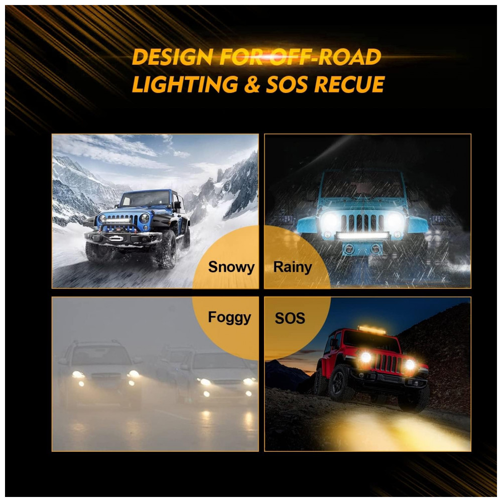 ULTRA ALTO BRILHO 100 dos esforços foram dedicados a ajudar os motoristas a economizar tempo, economizar dinheiro e dirigir com segurança. Este kit de barra de luz off road equipado com carcaça de liga de alumínio fundido 6063, uma lente de PC resistente à corrosão, pode fornecer uma combinação de feixe de inundação perfeita de 12000lm, para distância máxima à frente e iluminação periférica aprimorada ao longo das bordas da estrada.