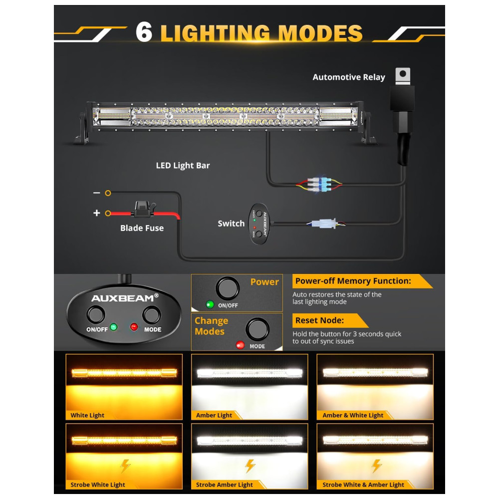 ATUALIZAR 6 MODOS DE ILUMINAÇÃO A barra de luz de 76 centimetros do feixe auxiliar com kit de chicote de fiação personalizado é muito adequada para luzes off road, luzes de advertência, faróis de neblina, luzes de direção ou luzes de trabalho. Você pode alternar entre 6 modos de direção através do nosso controle remoto luz de direção branca, luz de neblina âmbar, luz combinada branca e âmbar, luz intermitente branca, luz intermitente âmbar, luzes estroboscópicas branca e âmbar.