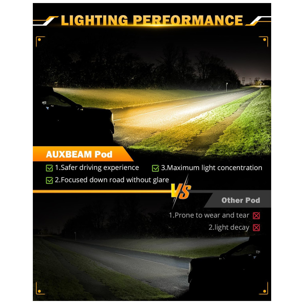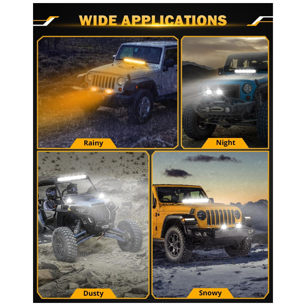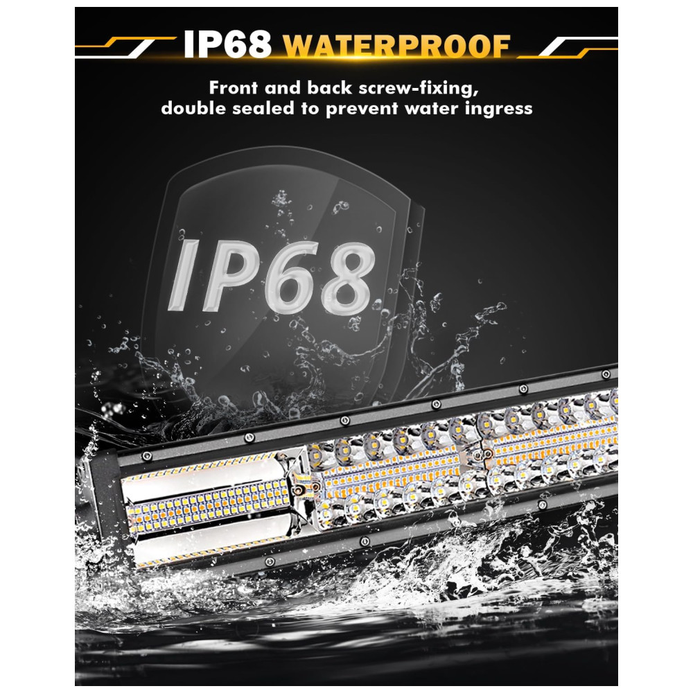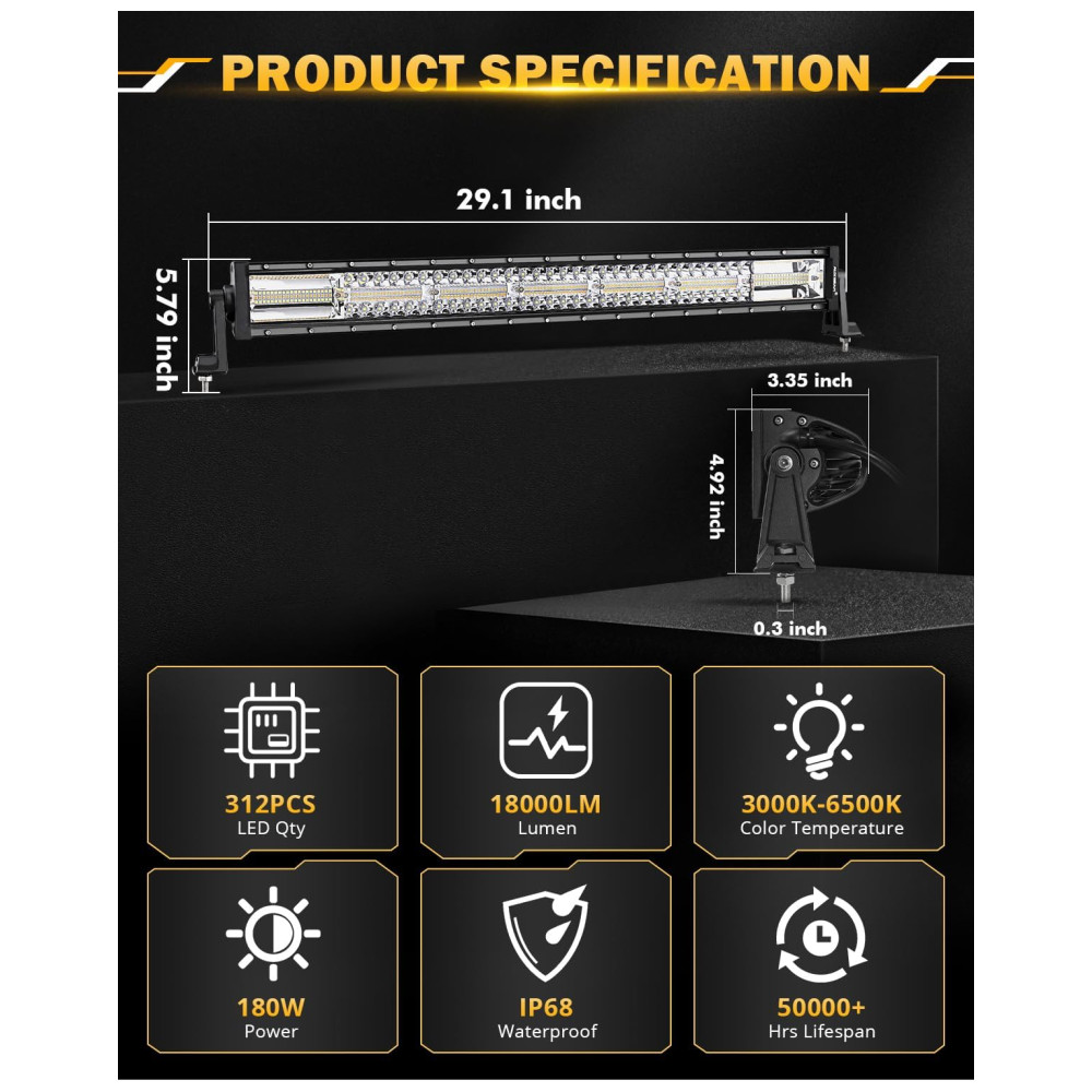 ULTRA ALTO BRILHO 100 dos esforços foram dedicados a ajudar os motoristas a economizar tempo, economizar dinheiro e dirigir com segurança. Este kit de barra de luz off road é equipado com carcaça de liga de alumínio fundido 6063, lente de PC resistente à corrosão e pode fornecer combinação de feixe de inundação perfeita de 18000lm, para distância máxima à frente e iluminação periférica aprimorada ao longo das bordas da estrada.