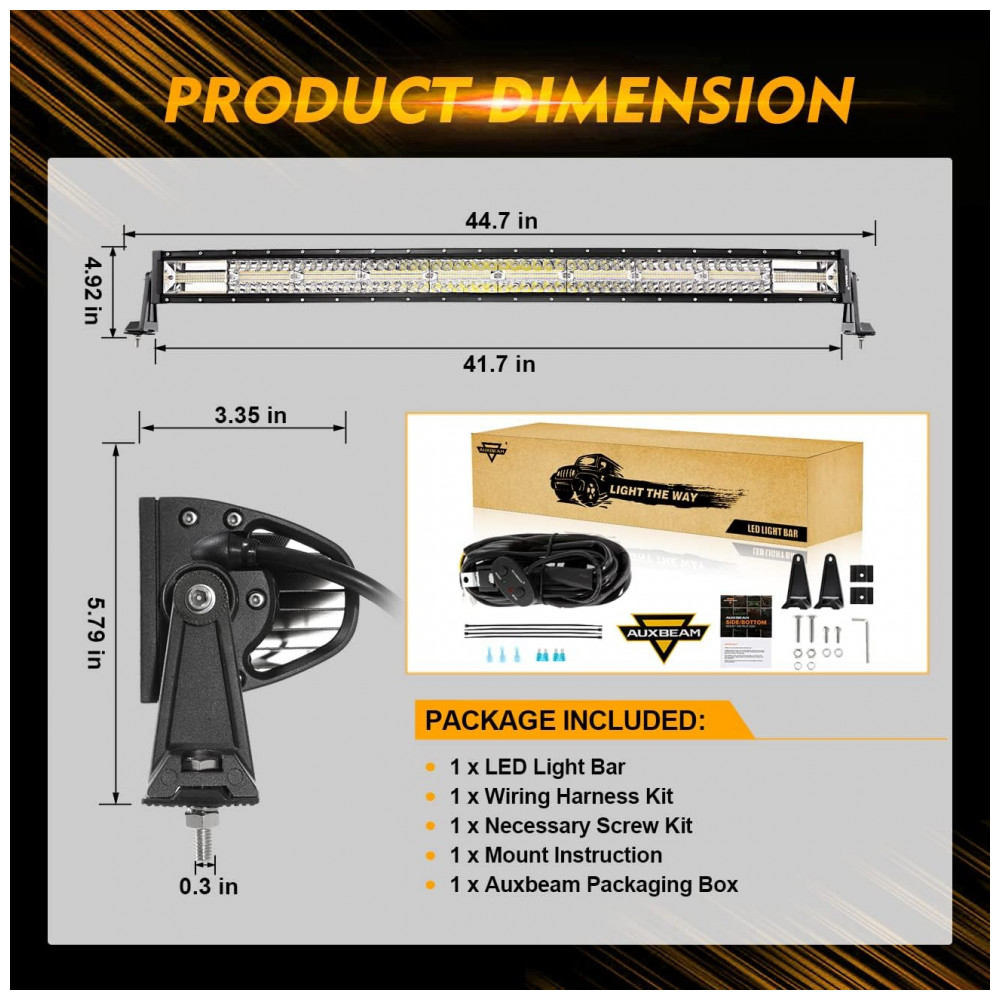 ULTRA ALTO BRILHO 100 de esforços foram dedicados para ajudar o motorista a economizar tempo, economizar dinheiro e dirigir com segurança. Este kit de barra de luz off road equipado com carcaça de liga de alumínio fundido 6063, lente de PC resistente à corrosão, pode fornecer combinação de feixe de inundação perfeita de 24000lm, para distância máxima à frente e iluminação periférica aprimorada ao longo das bordas da estrada.
