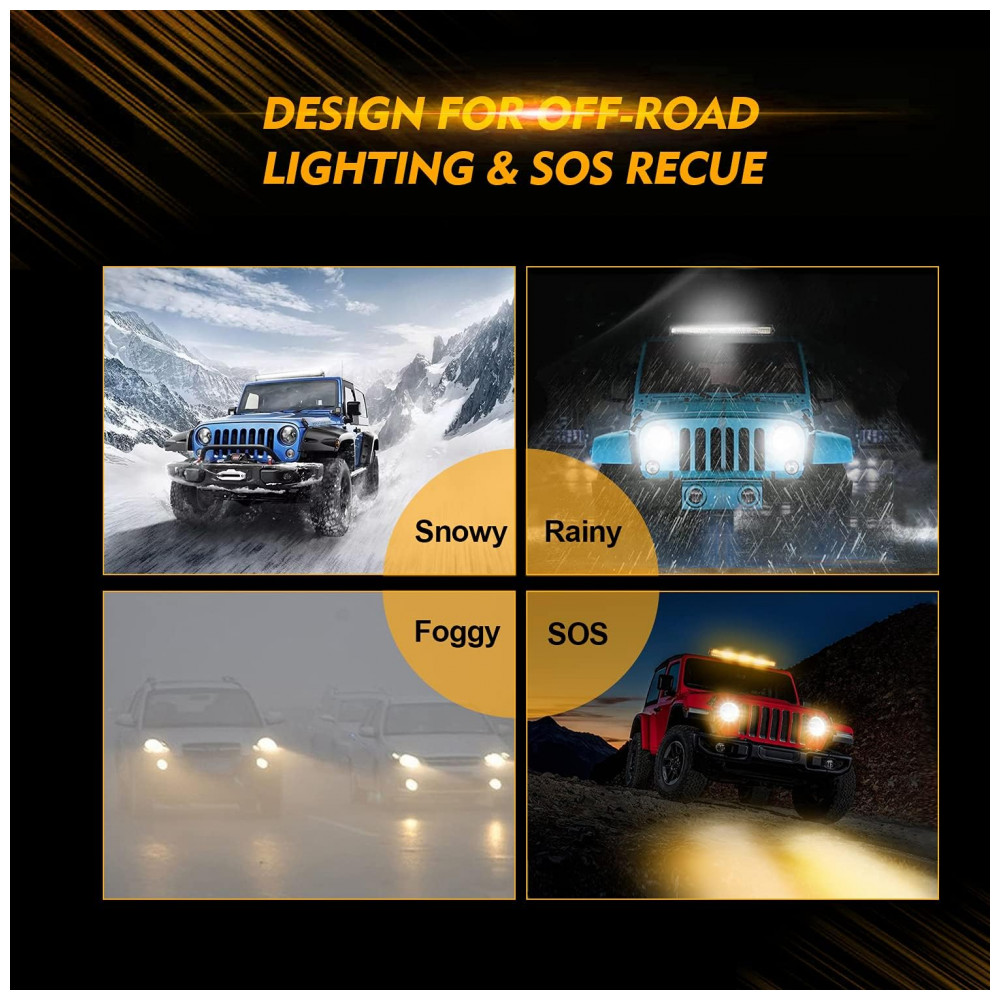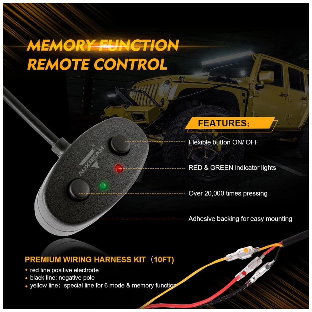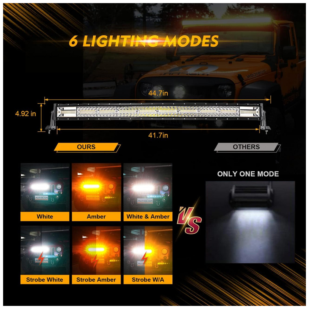 ATUALIZAR 6 MODOS DE ILUMINAÇÃO A barra de luz de 106 centimetros com kit de fiação personalizado é muito adequada para luzes off road, luzes de advertência, faróis de nevoeiro, luzes de condução ou luzes de trabalho. Você pode alternar entre 6 modos de direção através do nosso controle remoto luz de direção branca, luz de neblina âmbar, luz combinada branca e âmbar, luz intermitente branca, luz intermitente âmbar, luzes estroboscópicas branca e âmbar.