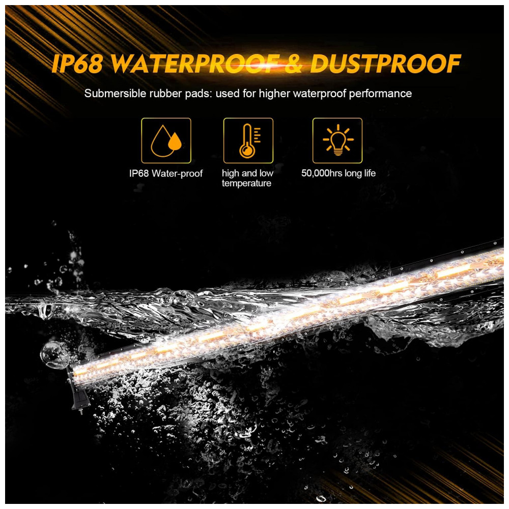 IP68 WATERPROOF RATE Barra de luz de 6 modos construída em IP68 à prova dágua, adota caixa de alumínio fundido à prova dágua atualizada e tecnologia de vedação avançada para suportar ambientes hostis e condições climáticas. Além disso, nossas luzes são integradas sem interferência eletromagnética EMC, resolvem o problema de interferência de rádio e cintilação.
