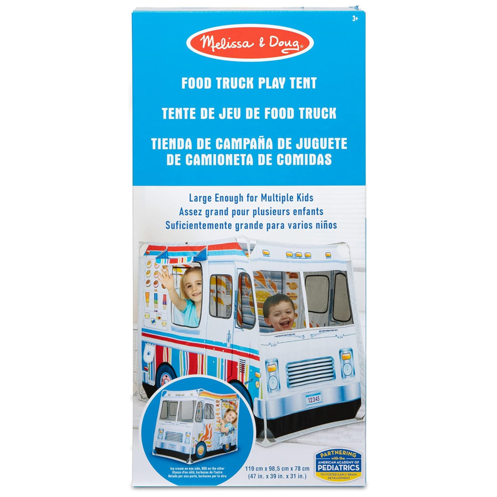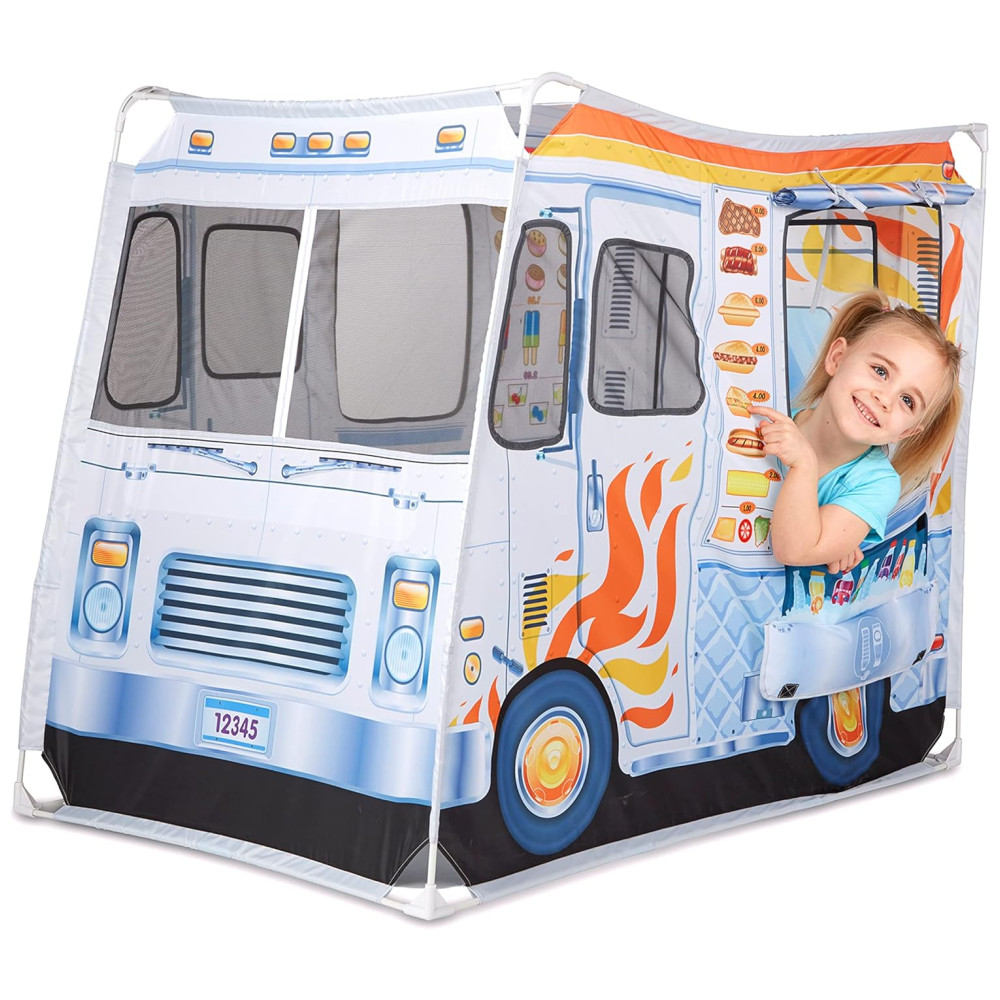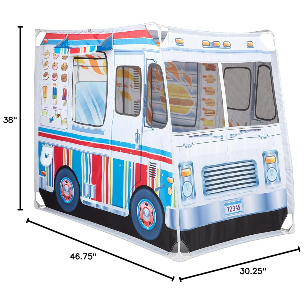 Esta barraca de brincar é perfeita para crianças que adoram cozinhar e soltar a imaginação Com mais de 0,91 metros de altura e quase 1,22 metros de comprimento, ela oferece muito espaço para várias crianças brincarem. O caminhão é coberto com obras de arte coloridas vibrantes e realistas, com janelas de serviço em ambos os lados.