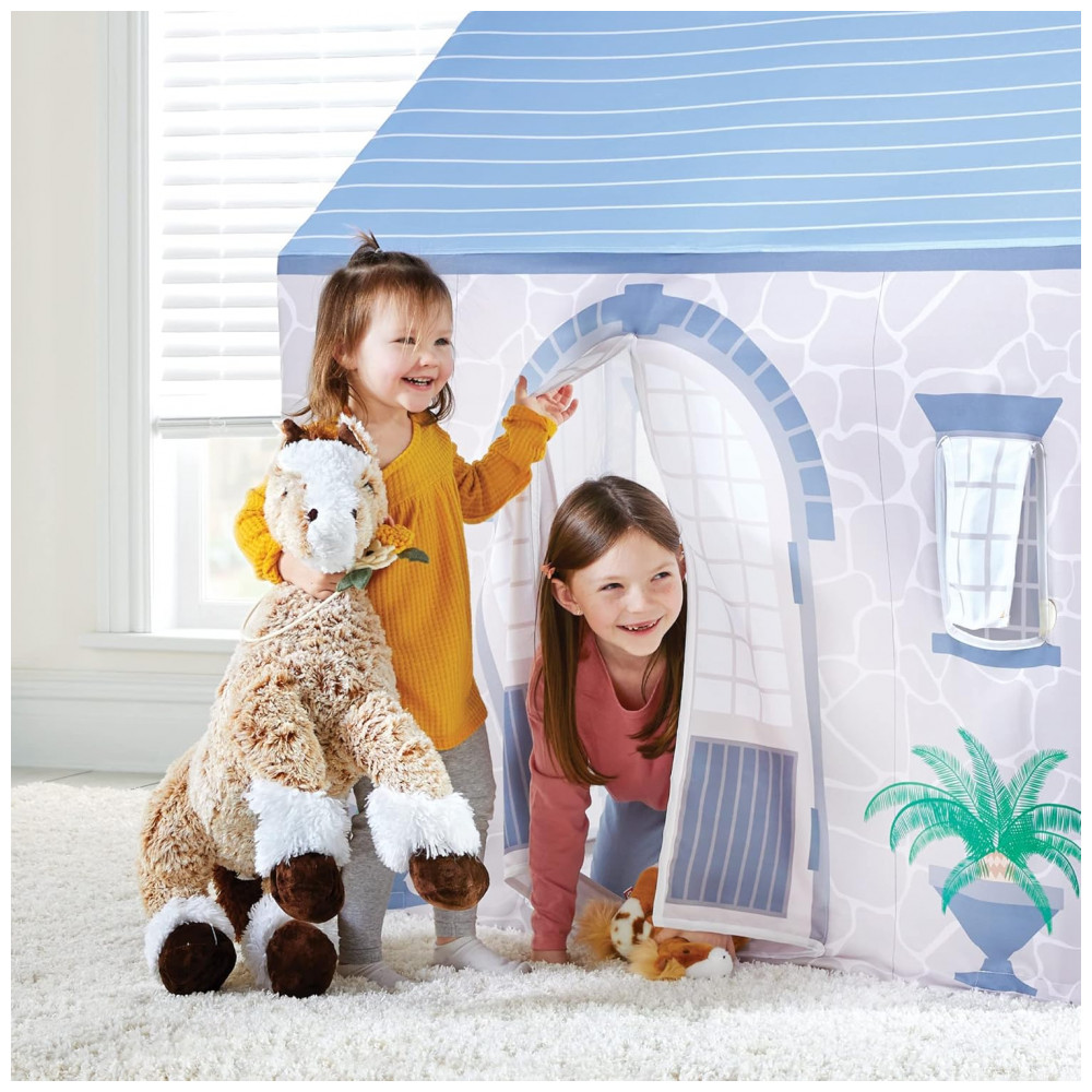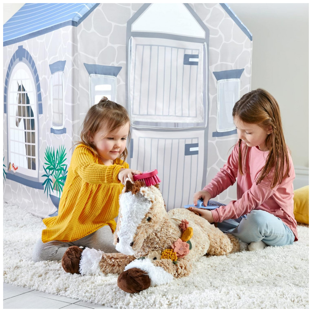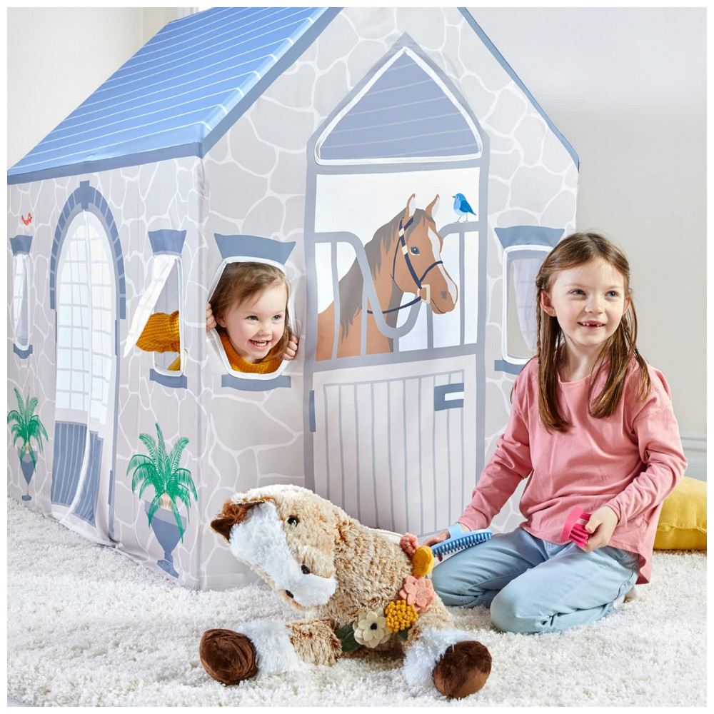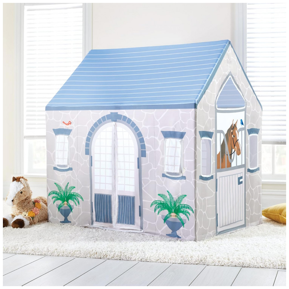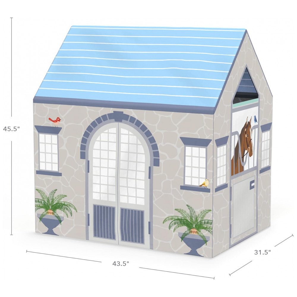 A Martha Stewart Kids’ Stable Play Tent é uma cabana infantil de grande porte para uso interno, com tema de estábulo, indicada para crianças a partir de 3 anos. As laterais trazem janelas com tela translúcida e ilustrações de cavalos, plantas, pedras e detalhes arquitetônicos, criando um cenário imersivo para brincadeiras de faz de conta relacionadas a fazenda, cuidados com animais e vida no campo.