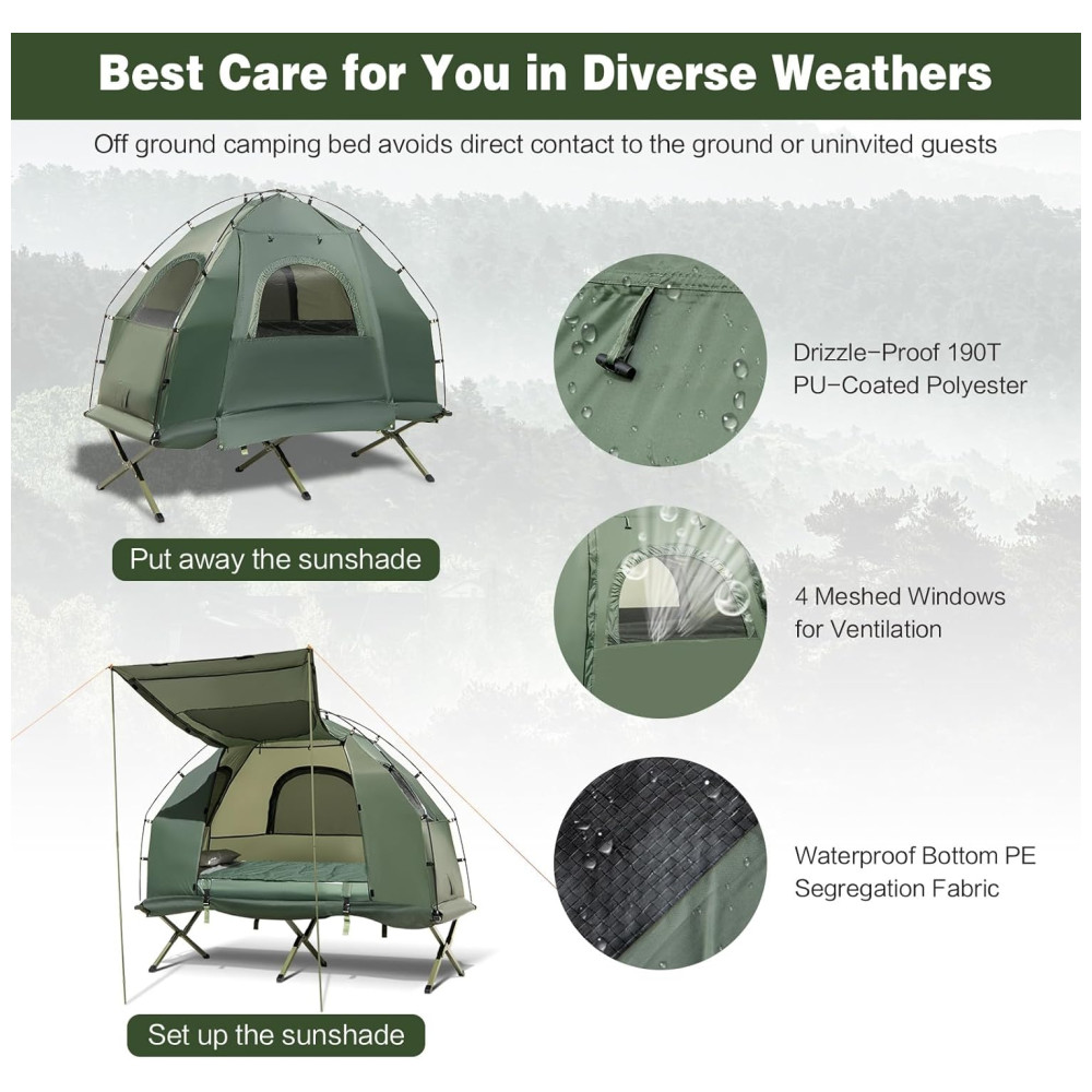 Fácil de montar e desmontar Com instruções de montagem detalhadas e todo o hardware entregue, é fácil montar sua cama de barraca em alguns minutos. Tanto a barraca quanto a cama de camping são dobráveis, o que economiza muito espaço quando não está em uso. E um saco de rodas livre permite que o conjunto de tendas seja fácil de transportar para qualquer lugar