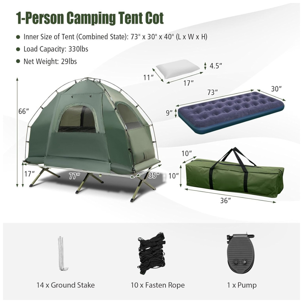 All in 1 Camping Combo Combinando uma tenda com uma cama de campismo, o nosso berço de tenda é económico. Vem com um conjunto completo de roupa de cama que inclui 1 saco de dormir, 1 colchão de ar e 1 travesseiro inflável tanto a capa do colchão quanto a capa do travesseiro são fornecidas. E também fornecemos uma bomba de pé e outros acessórios necessários.