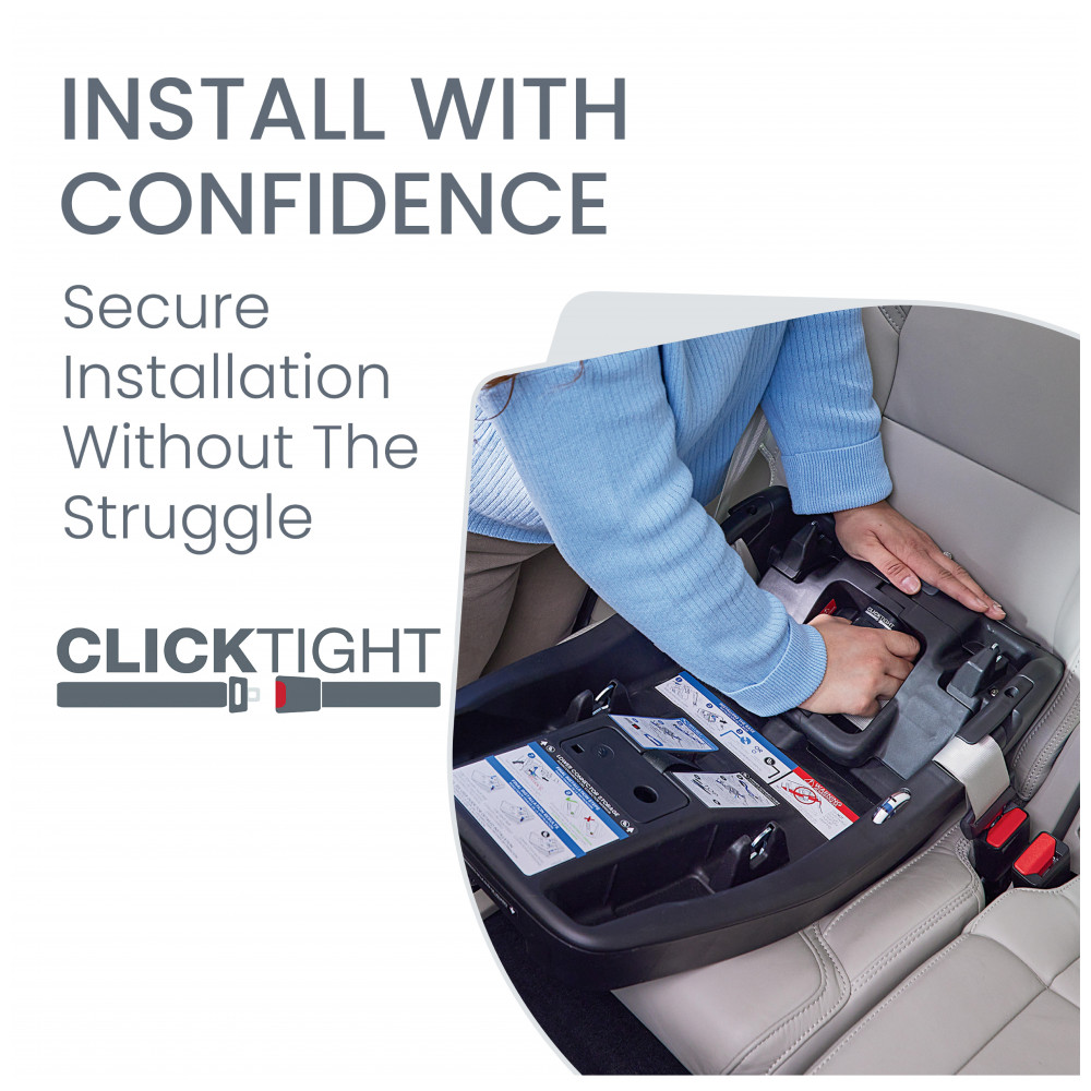 Instale com confiança a cada vez. A instalação ClickTight é segura e livre de complicações, seja utilizando o cinto de segurança do veículo ou os conectores inferiores. O indicador ClickTight fornece um guia visual durante a instalação da base. Indicadores de nível e reclinação assistida por mola tornam rápido e fácil encontrar o ângulo correto. A base Aspen é compatível com os assentos de carro infantis Willow, Willow S, Willow SC e Cypress. A janela do indicador pode variar de acordo com o modelo.