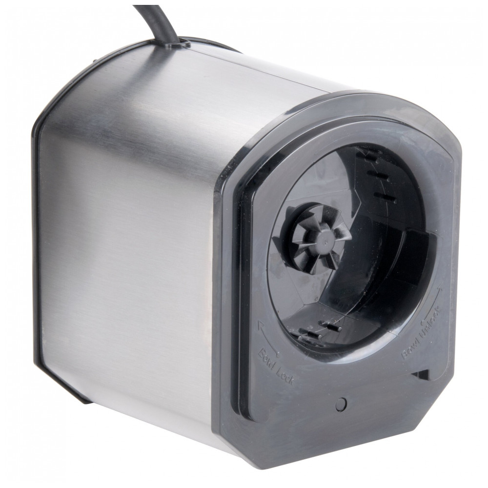 Motor de 175 W aciona lâminas fixas em aço inoxidável para moagem fina ou grossa. Sistema de segurança interrompe operação sem tampa posicionada corretamente.