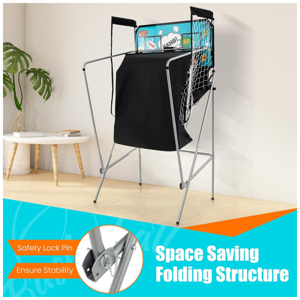 Design Dobrável e Conveniente: Com um design fácil de usar, esta máquina de basquete pode ser facilmente dobrada para armazenamento prático. O pino de bloqueio seguro mantém a estrutura firme quando não estiver em uso, garantindo tranquilidade.