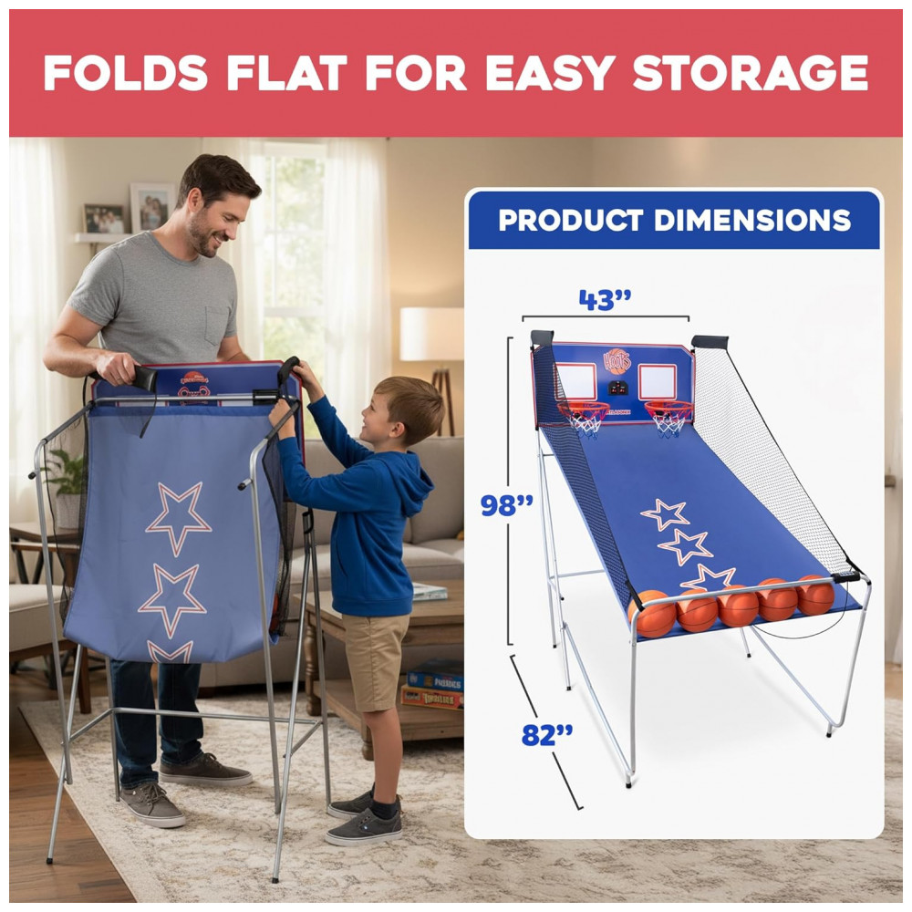 O aro de basquete dobrável otimiza seu espaço. Perfeito para qualquer estilo de vida, esse jogo de basquete arcade é ideal para adultos que buscam diversão dentro de casa.