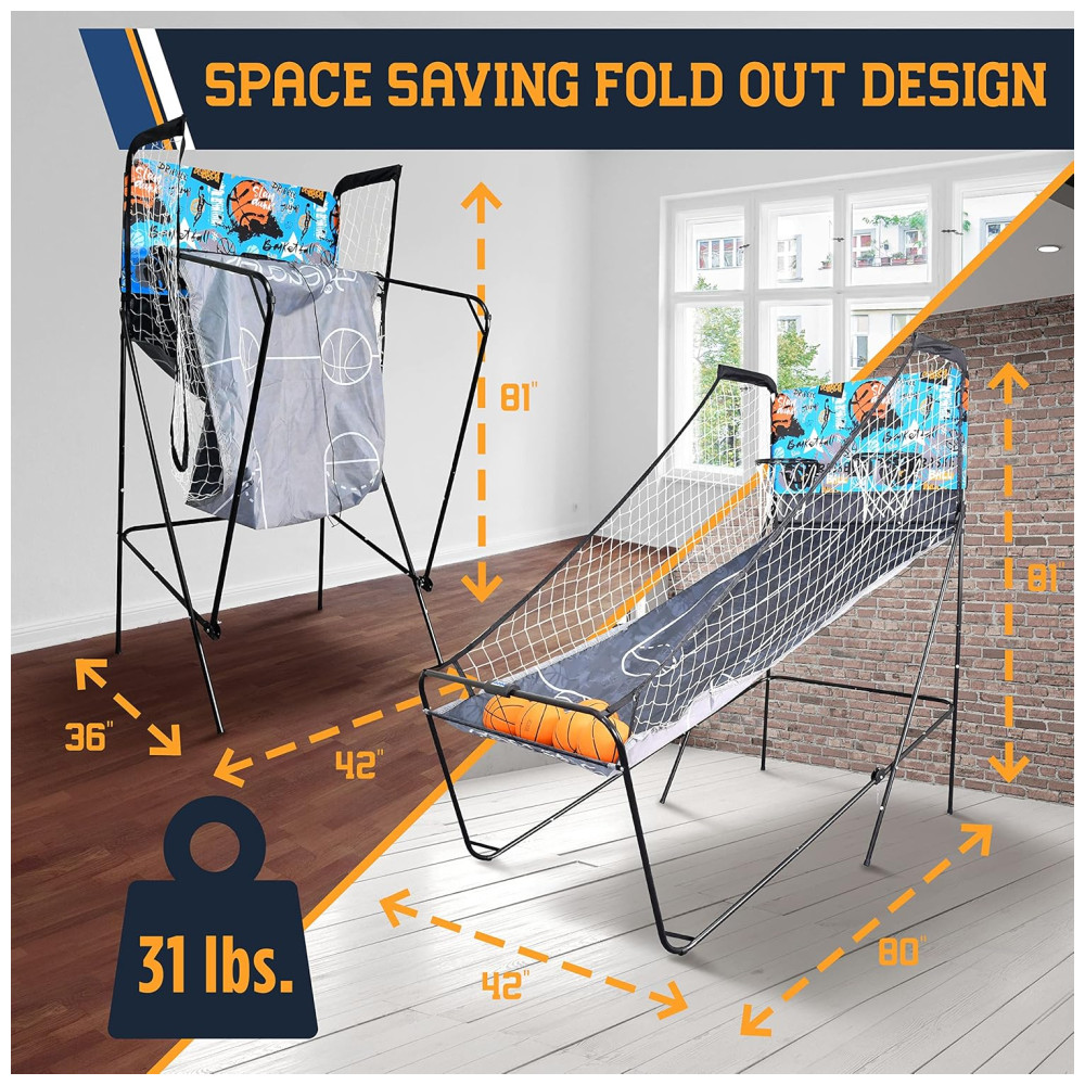 Design Dobrável que Economiza Espaço: Transforme qualquer ambiente em uma sala de arcade. A cesta de basquete dobrável vai de 203 cm para 91 cm, economizando espaço quando não estiver em uso. Dobra facilmente para armazenamento.