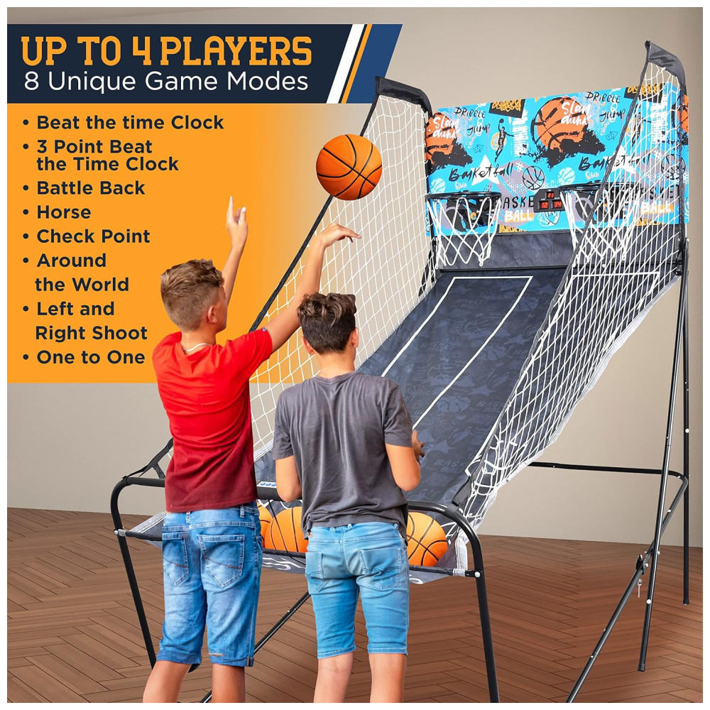 Jogo de Basquete Arcade para 4 Jogadores com 8 Modos Exclusivos: Modos incluídos: vencendo o tempo, 3 pontos vencendo o tempo, batalha, cavalo, checkpoint, ao redor do mundo, arremesso esquerda e direita, 1 contra 1.