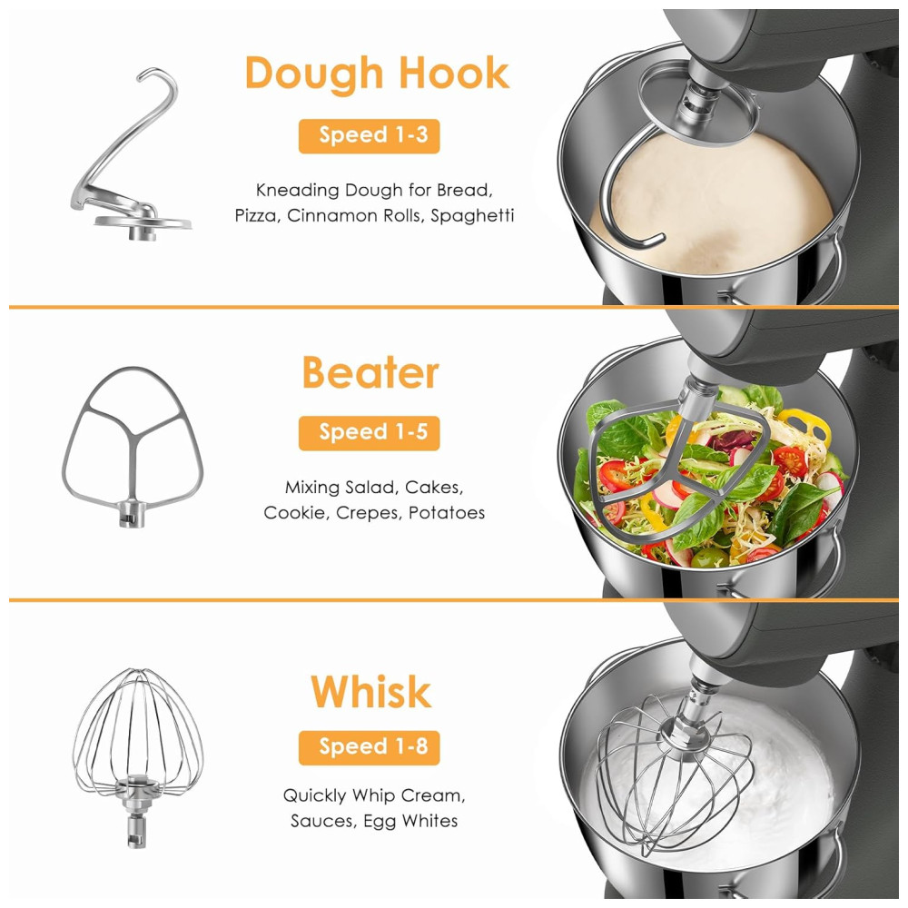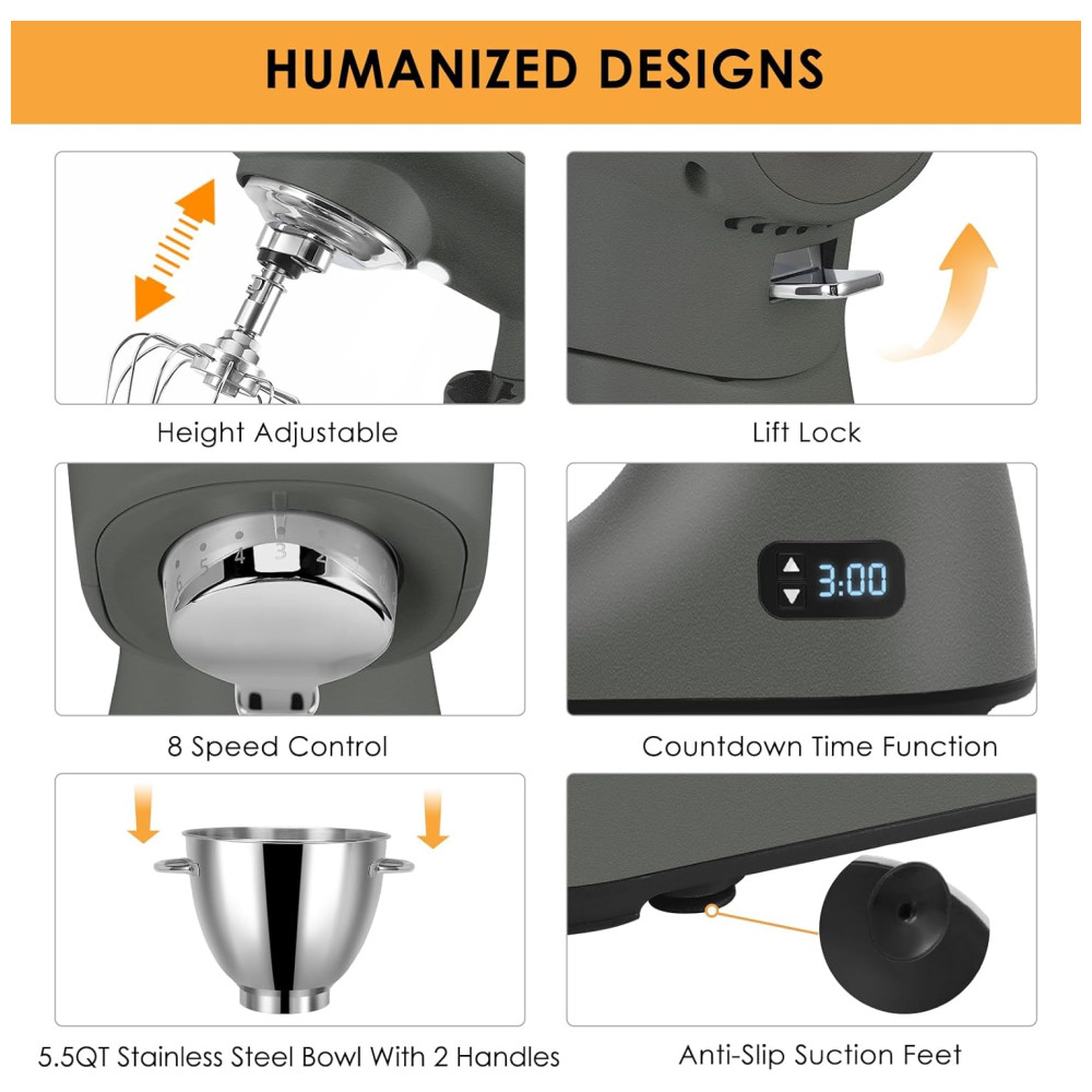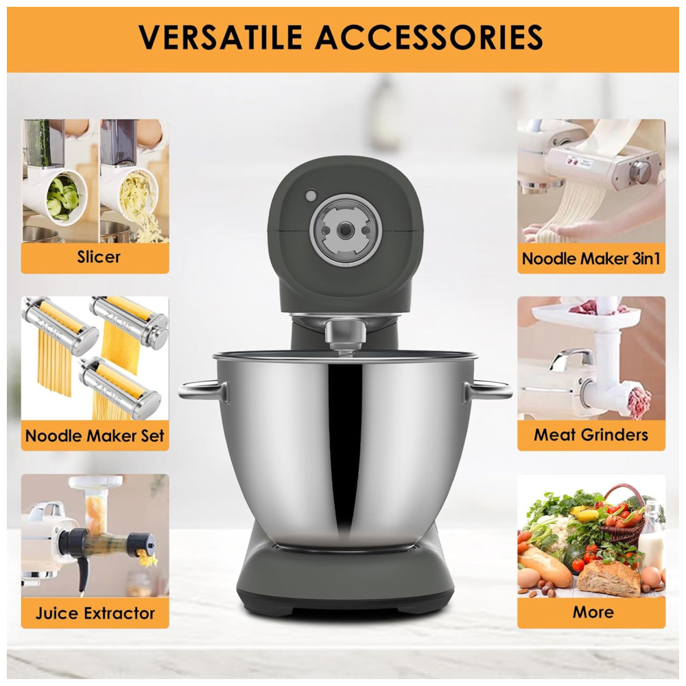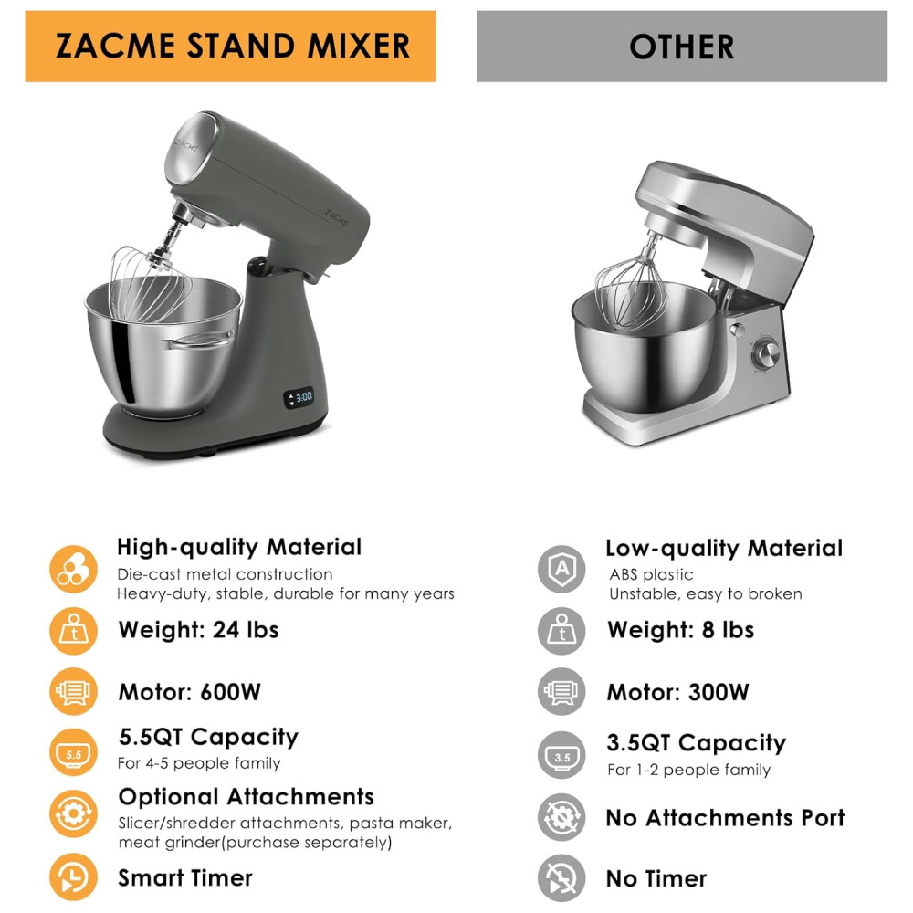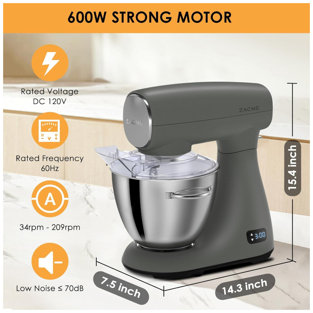 A batedeira planetária ZACME, na cor cinza, combina engenharia avançada e robustez, ideal para uso doméstico intensivo e receitas variadas. Possui corpo em alumínio fundido, engrenagens metálicas e motor DC de 600W com controle eletrônico por chip 32-bit, garantindo funcionamento estável, baixo ruído (a partir de 45 dB) e durabilidade. O bowl em aço inox de 5,5 litros apresenta trava de segurança com quatro fixadores. Os acessórios – gancho, pá misturadora e batedor de arame – são fabricados em inox, laváveis em lava-louças. Sistema tilt-head para acesso facilitado, oito velocidades e timer digital com display LED permitem ajustar o tempo de preparo com precisão. O recurso duplo de resfriamento impede superaquecimento durante uso contínuo, mantendo a temperatura externa segura. Pés com sistema antichoque e base isolada proporcionam estabilidade extra, sendo indicada para massas, claras, cremes e receitas densas, além de suportar acessórios opcionais vendidos separadamente.