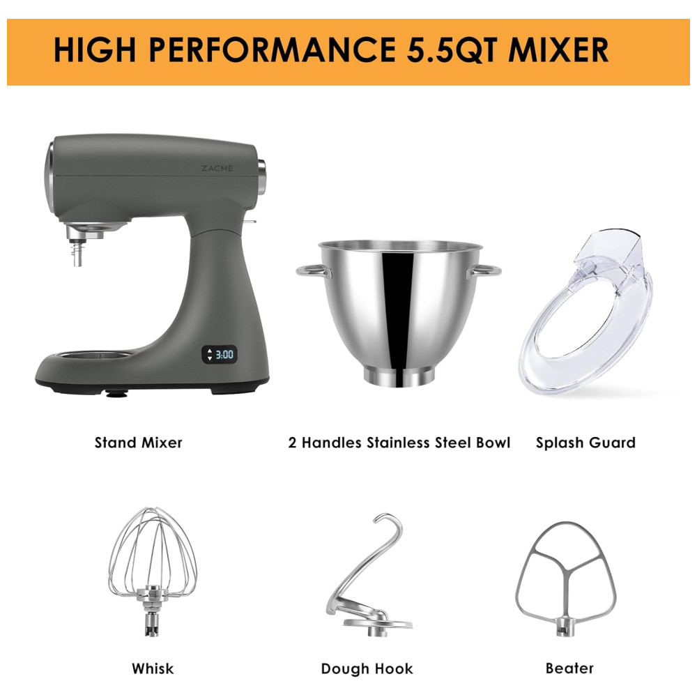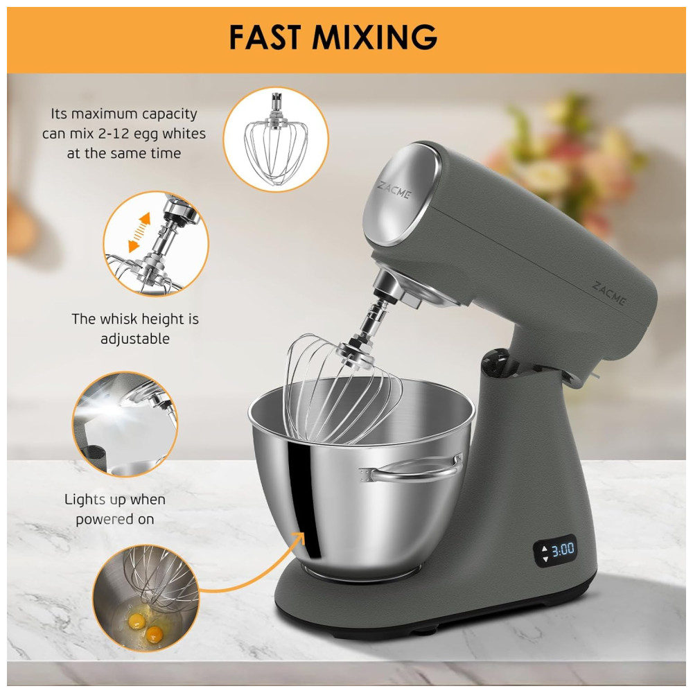 Batedeira Planetária ZACME Cinza 8 Velocidades 55L 600W Corpo Metálico Motor DC Display LED Timer Resfriamento Silenciosa 110V