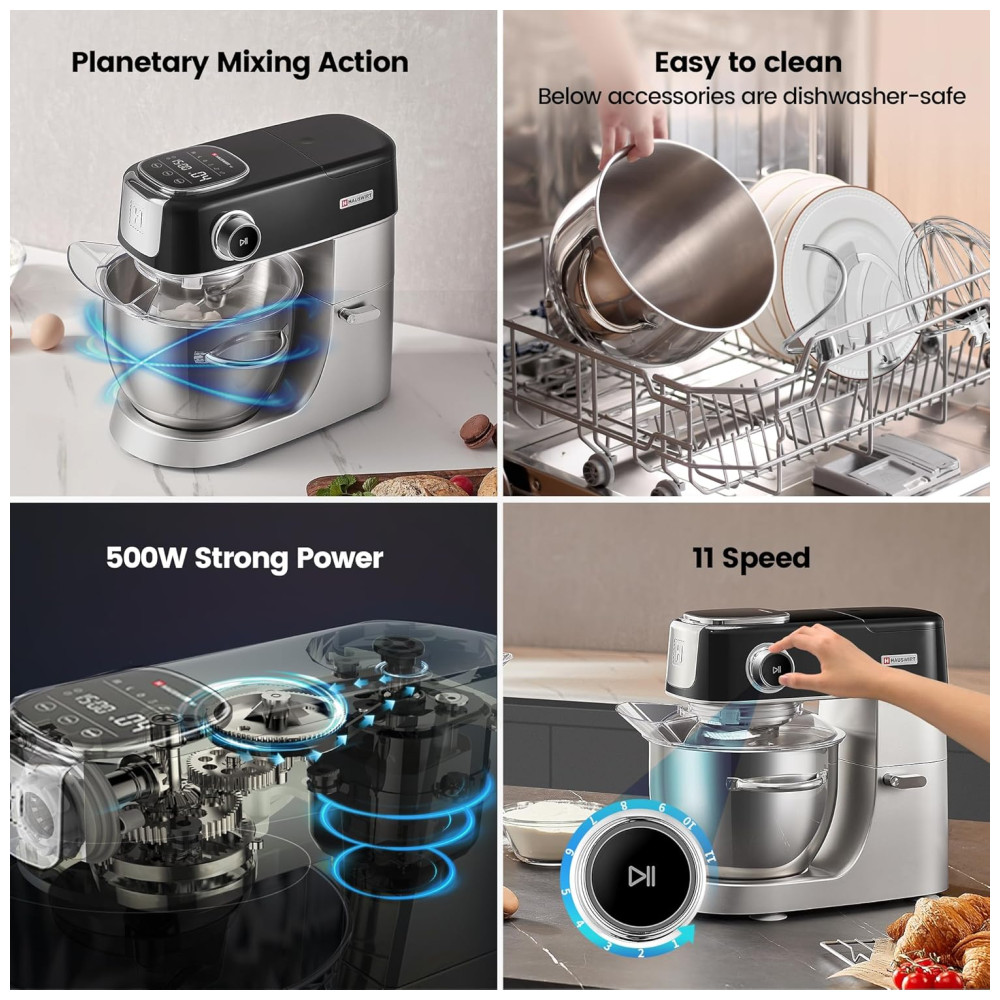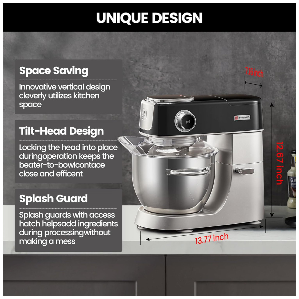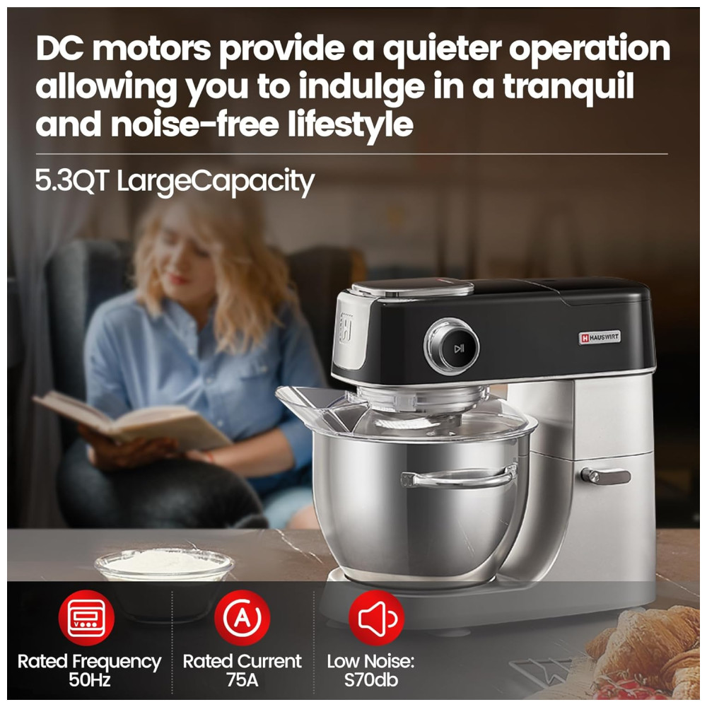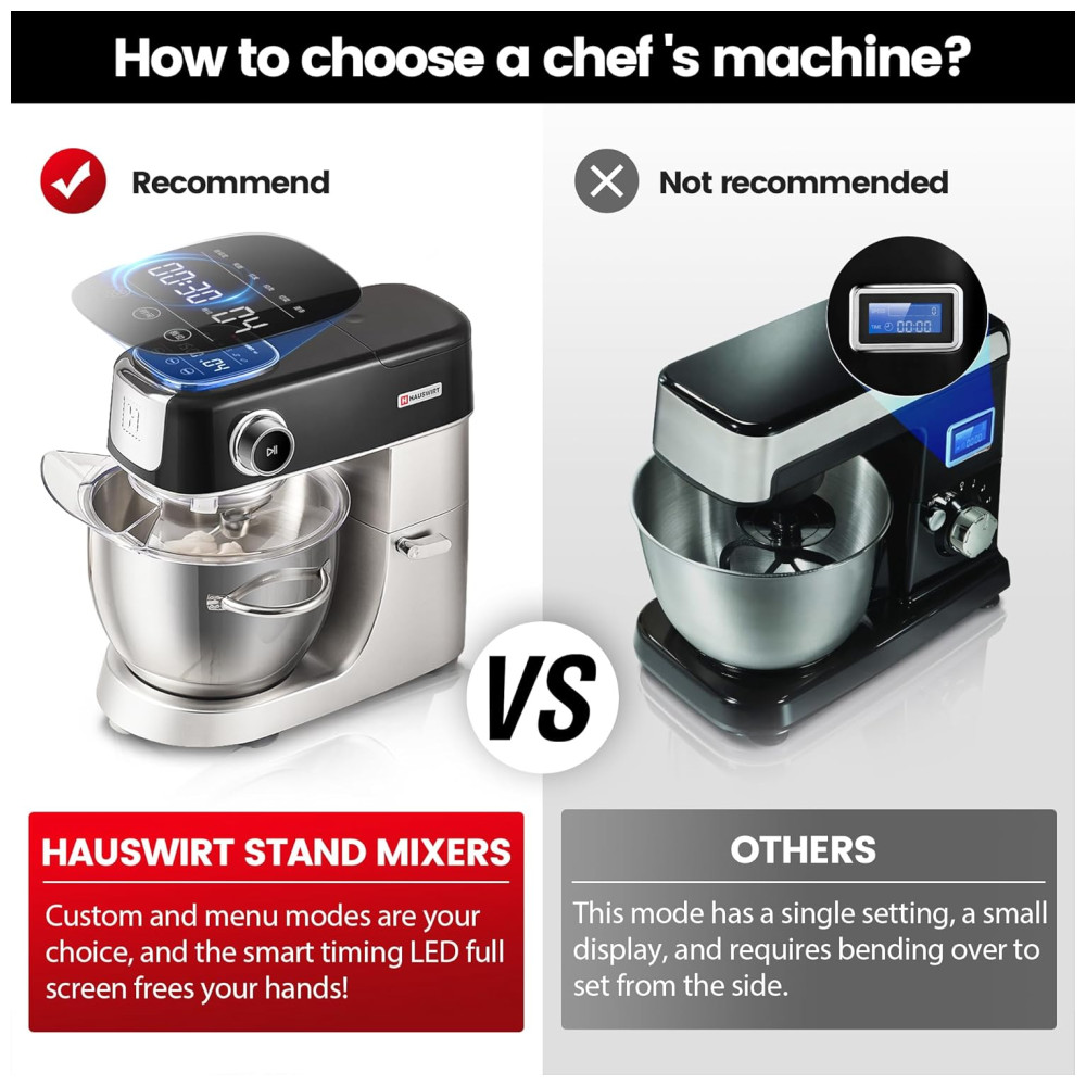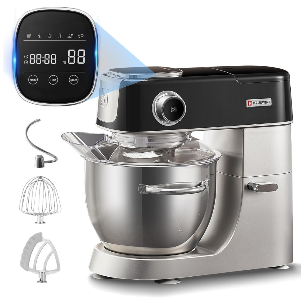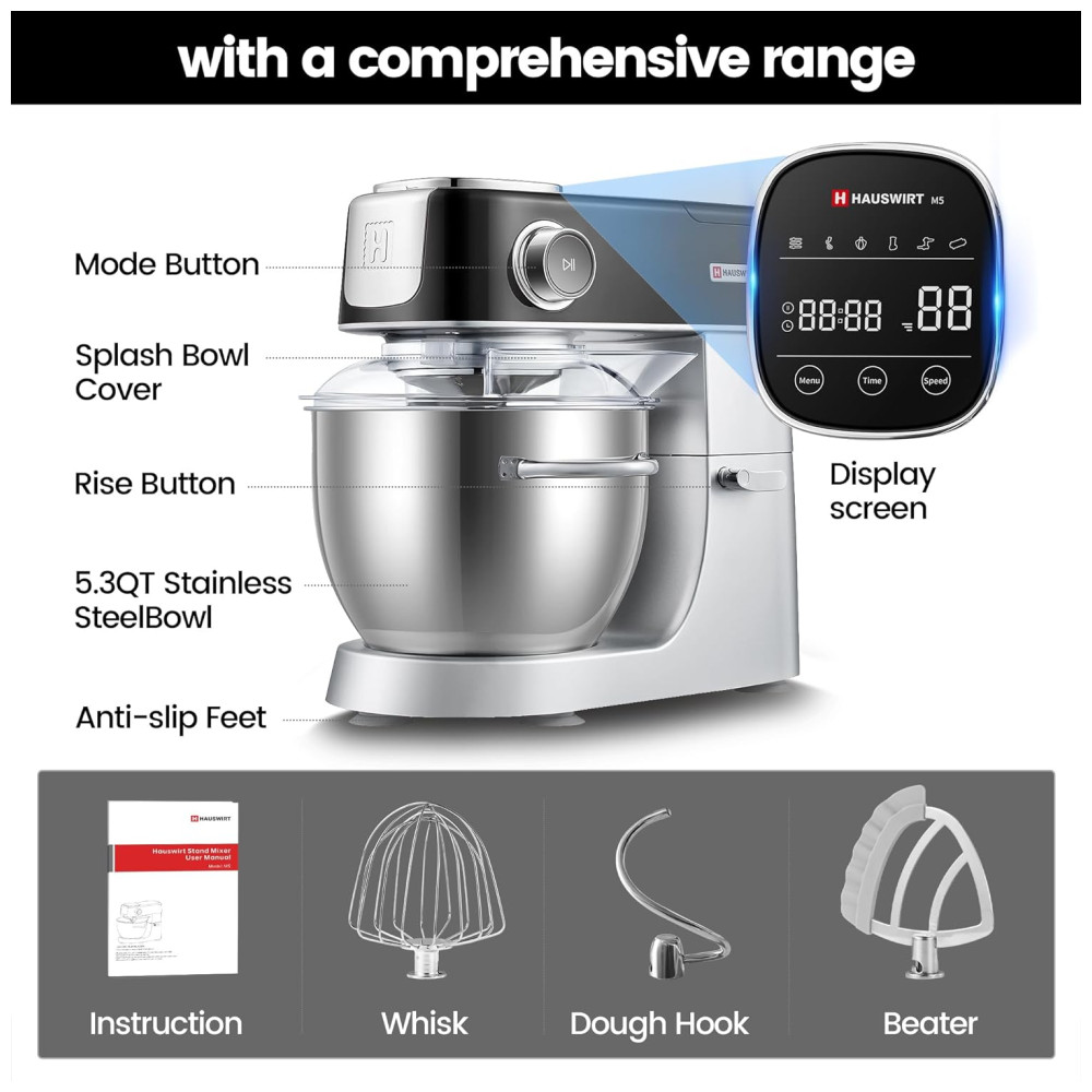 A batedeira elétrica HAUSWIRT possui um design exclusivo com tela de toque LED, que oferece uma exibição em tempo real do tempo e da engrenagem. Com dois modos modo rápido e modo de configuração automática , esta batedeira é muito conveniente. A tigela de mistura é de aço inoxidável e tem uma capacidade de 4,94 litros, além de uma tampa contra poeira visível e transparente. O design especial de aninhamento permite flexibilidade para alterar o fluxo de trabalho e processar suas necessidades.
