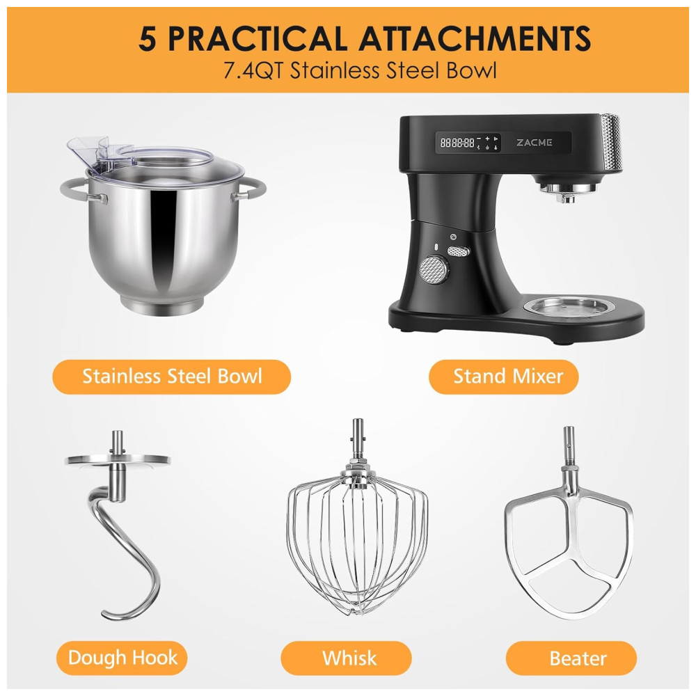 Batedeira 7L com 10 Velocidades e 3 Acessórios de Aço Inoxidável 110V 800W ZACME Preta
