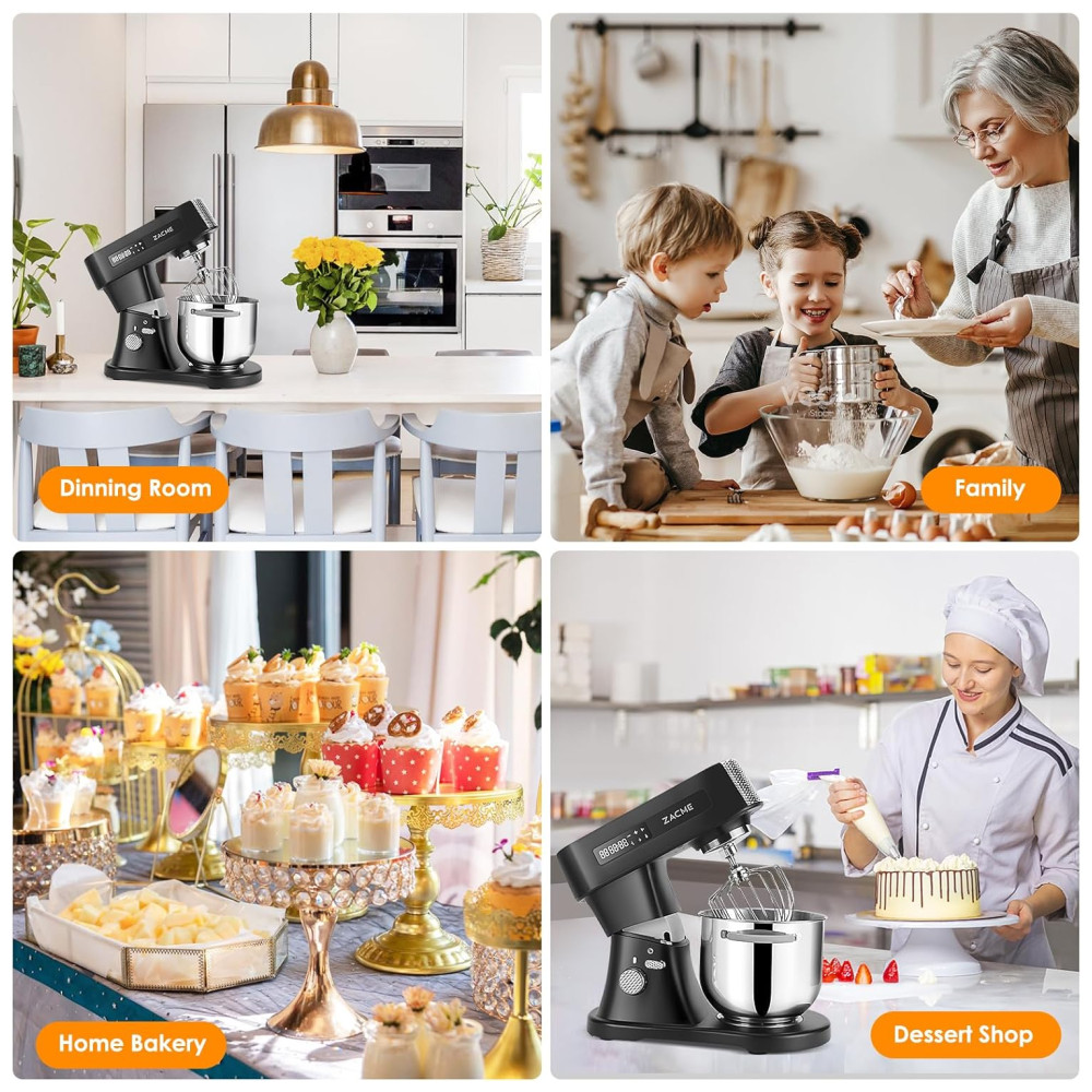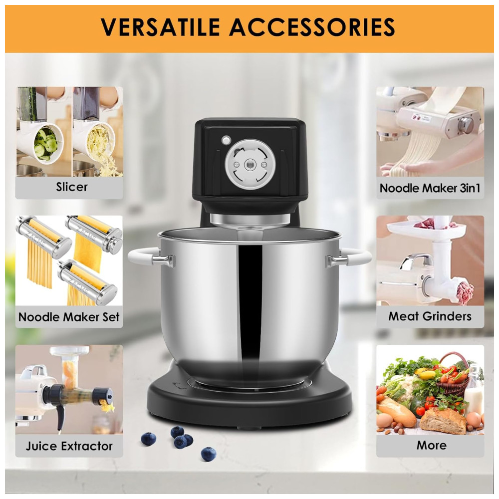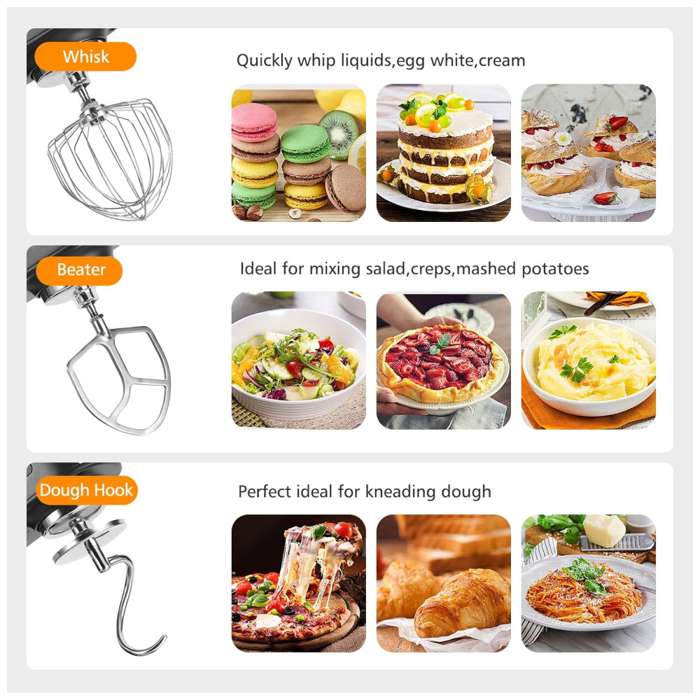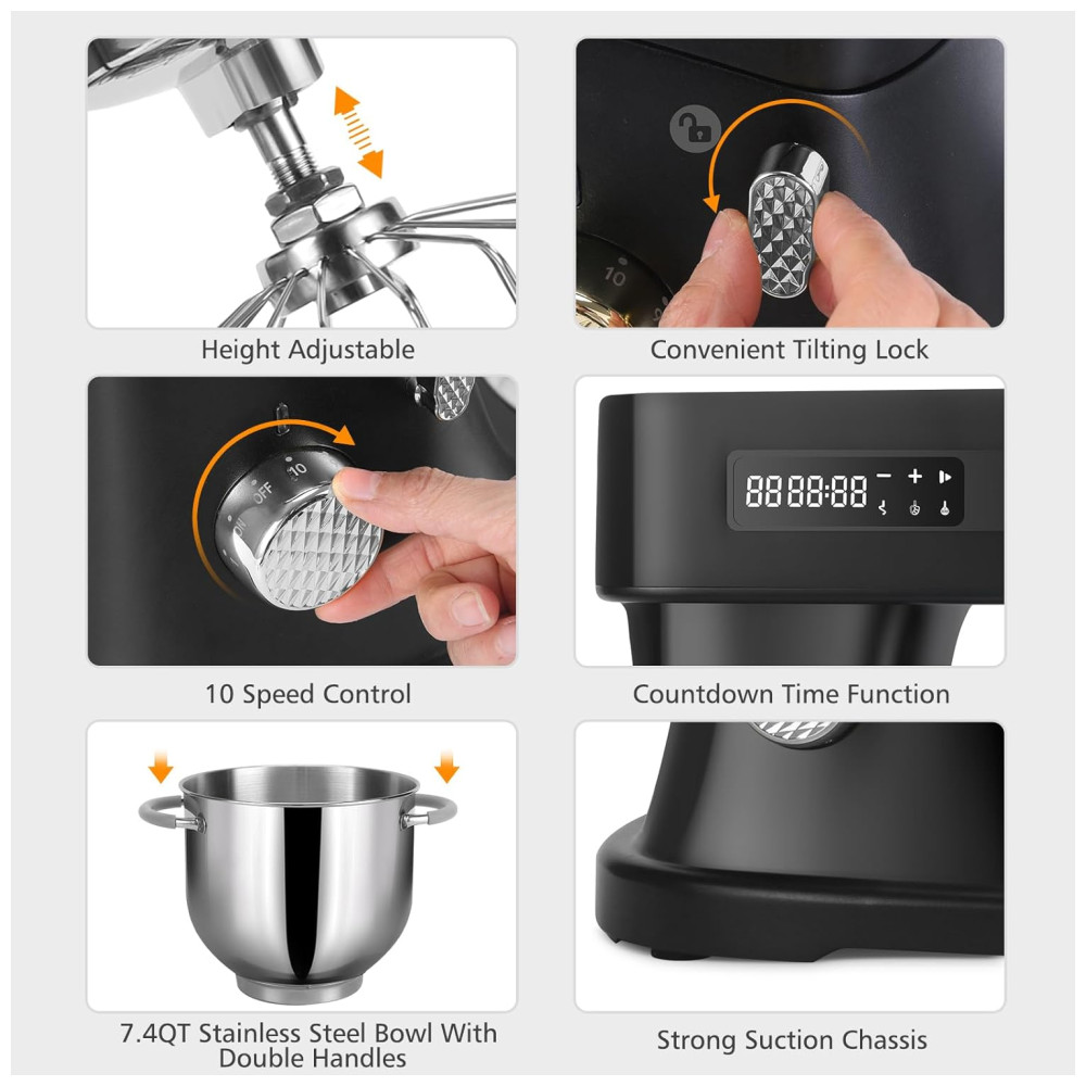 O design de cabeça inclinada com display LED transparente permite definir um tempo de contagem regressiva, permitindo que você faça outras coisas enquanto o liquidificador está funcionando, economizando efetivamente seu tempo. Conjunto de vários acessórios, incluindo gancho de massa de aço inoxidável, batedor de arame, batedor plano e tigela de aço inoxidável com capacidade de 7 litros. Todas as alturas são ajustáveis para lidar com grandes quantidades pequenas.