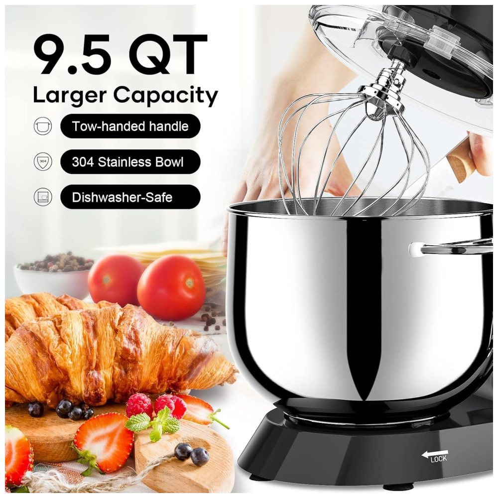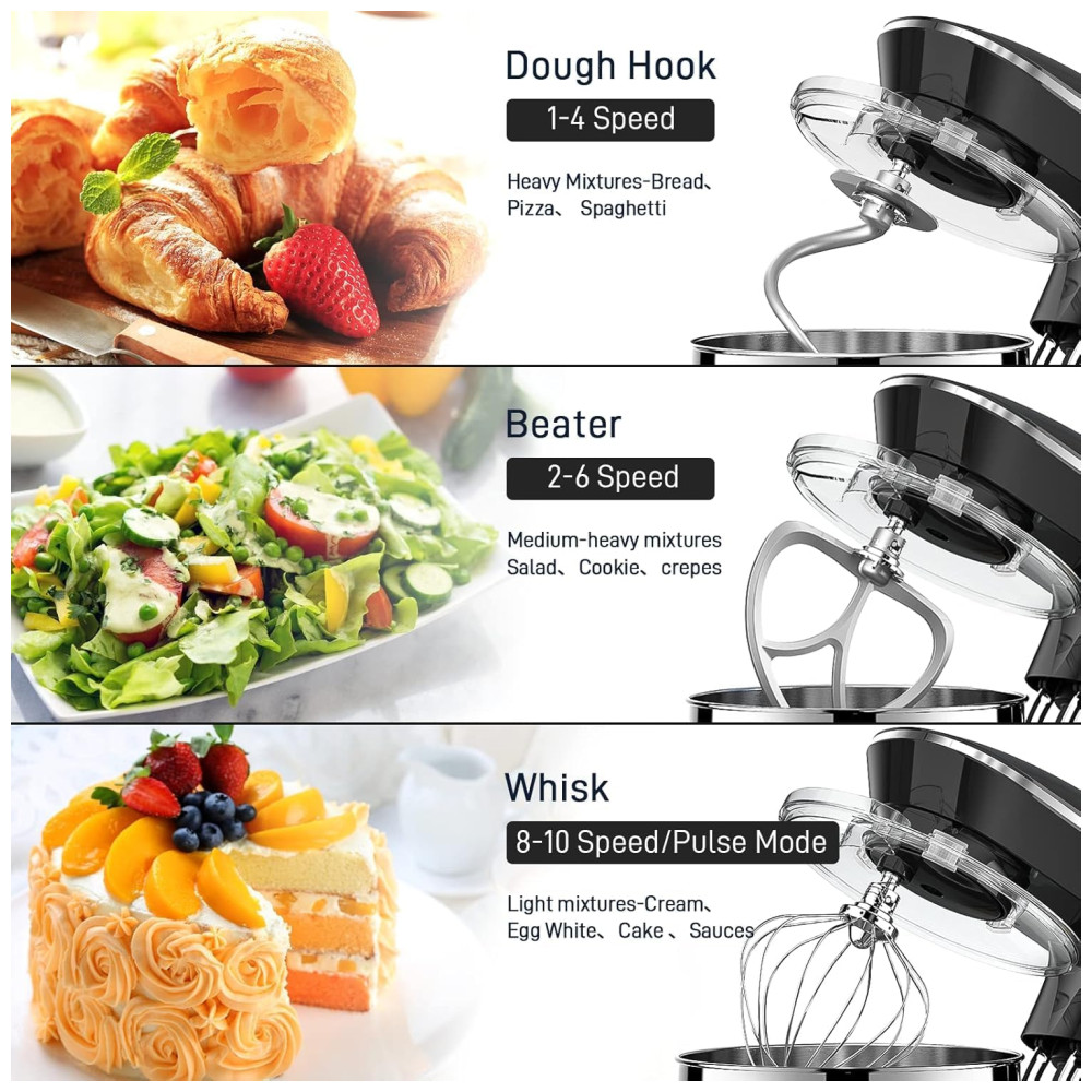 A batedeira de alimentos Vezzio possui um batedor, gancho de massa e batedor, oferecendo uma mistura de versatilidade de mistura para misturar, bater, bater, amassar ou misturar ovos ou creme. Esteja você fazendo bolos, pães, biscoitos ou doces, a proteção contra respingos da batedeira com escotilha de acesso ajuda a evitar sujeira, enquanto os acessórios de mistura próprios para lava louças facilitam a limpeza.