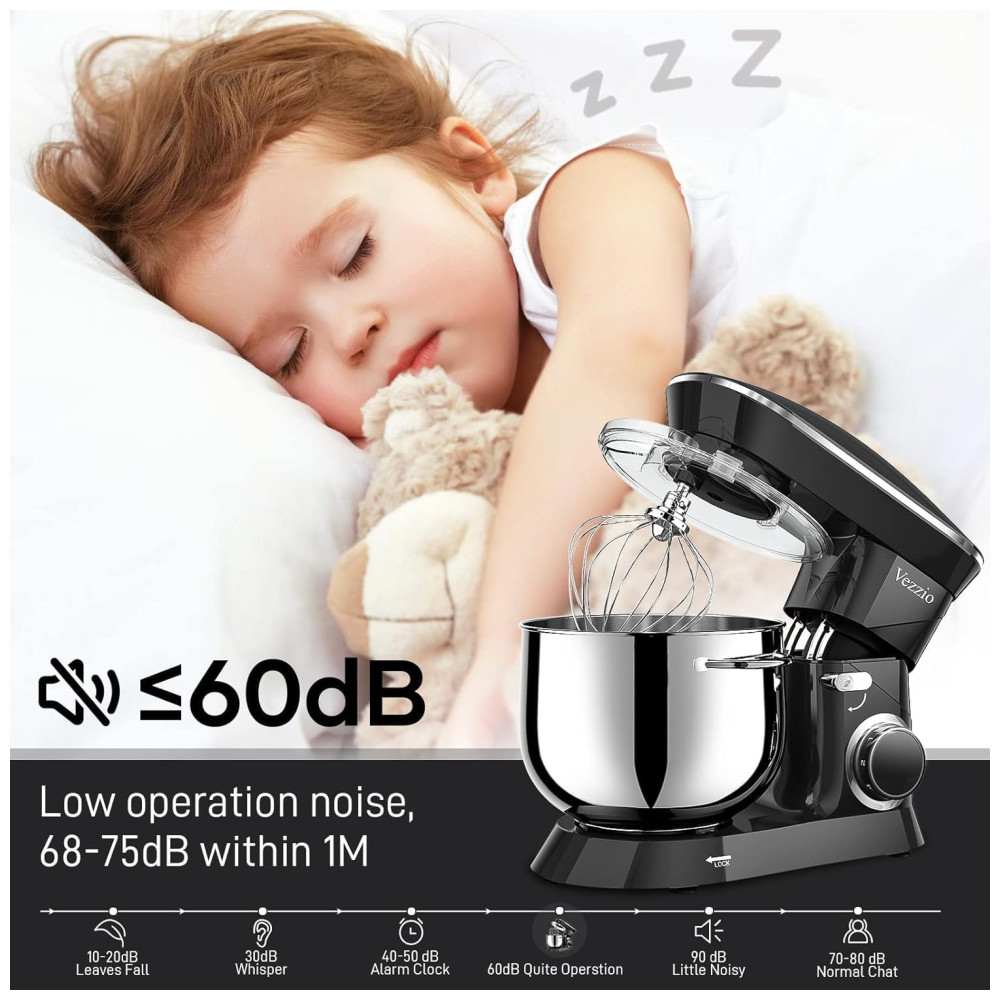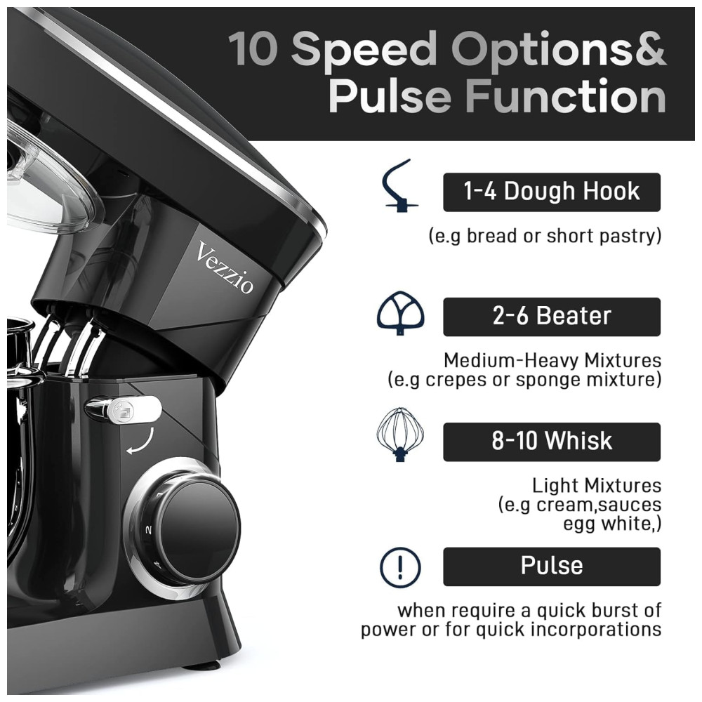 A batedeira de cozinha Vezzio possui um motor de alto desempenho de 660 W que amassa e mistura com velocidade extremamente rápida, mas opera silenciosamente a 60,0 DB. O controle de 10 velocidades com função pulsar permite que você prepare uma variedade de receitas, de massa a sorvete, de clara de ovo a massa de pão, tornando a a batedeira preferida para os aficionados da panificação.